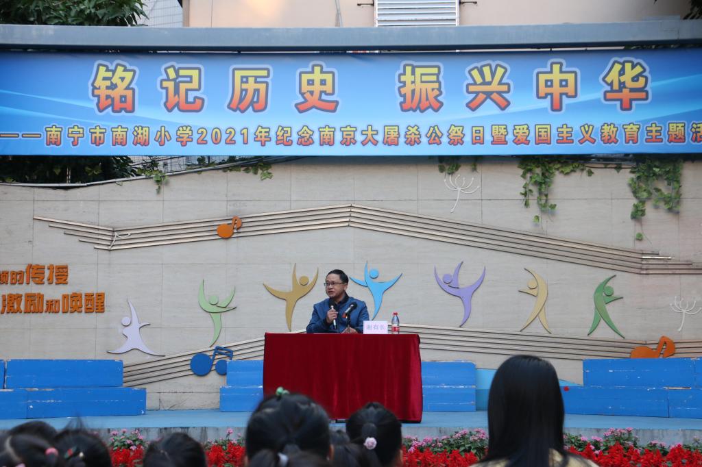 12月13日是南京大屠杀死难者国家公祭日。这天,马克思主义学院院长谢有长应邀来到南宁市南湖小学,为该校师生作题为“以史为鉴,开创未来,为实现中华民族伟大复兴而发奋读书”的主题报告。