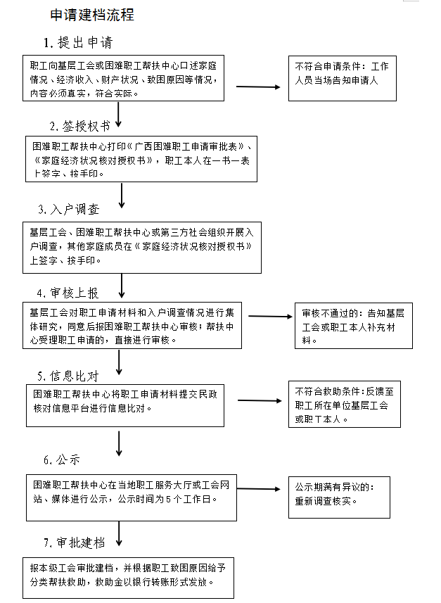 困难职工建档所需相关材料及相关政策说明已经发布(见附件),本工会小组如有符合条件的困难职工,请如实填《广西困难职工申请审批表》、《家庭经济状况核对授权书》报送至校工会,校工会汇总后报送至区总工会困难职工帮扶中心,经区总工会困难职工帮扶中心或第三方社会组织开展入户调查,提交民政部门核对信息平台进行信息比对审核,建档后进行帮扶。根据困难职工的致困原因,主要可以得到以下救助: