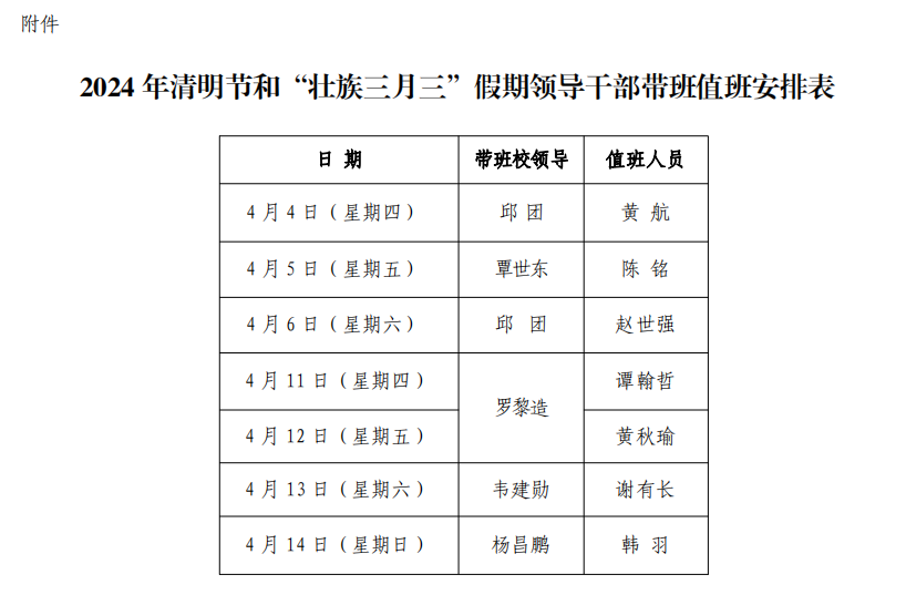 附件:2024年清明节和“壮族三月三”假期领导干部带班值班安排表