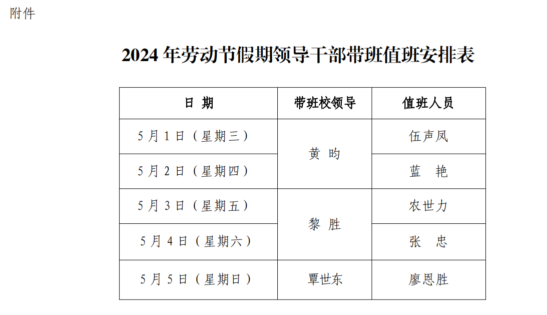 附件:2024年劳动节假期领导干部带班值班安排表