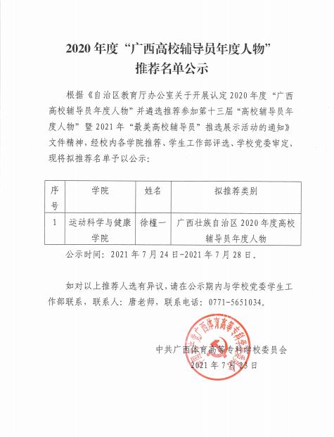 爱体育电子官方网站2020年度“广西高校辅导员年度人物”推荐名单公示