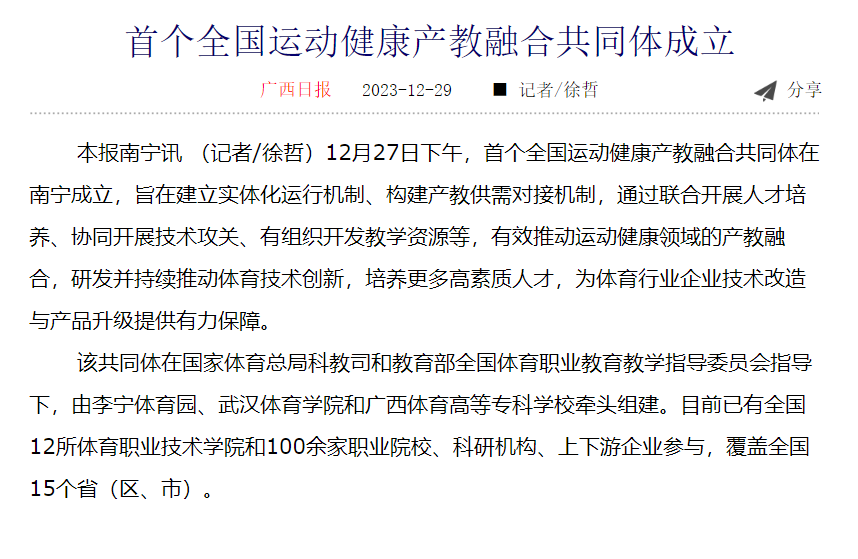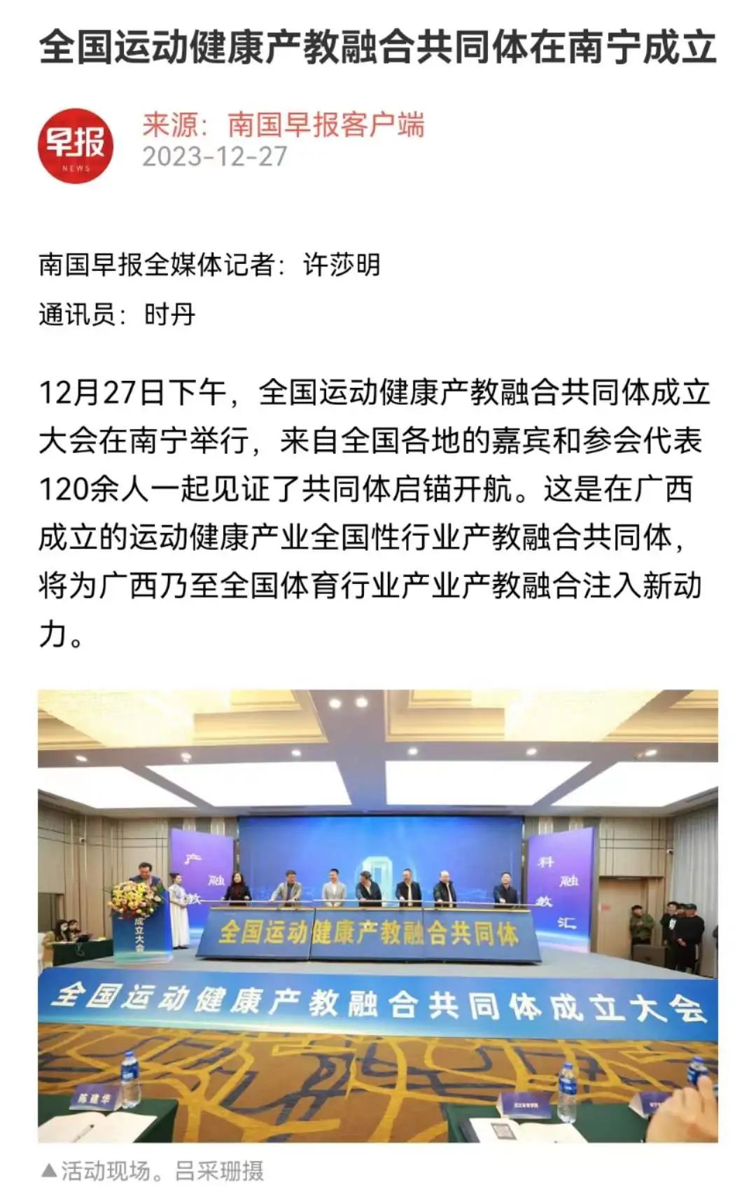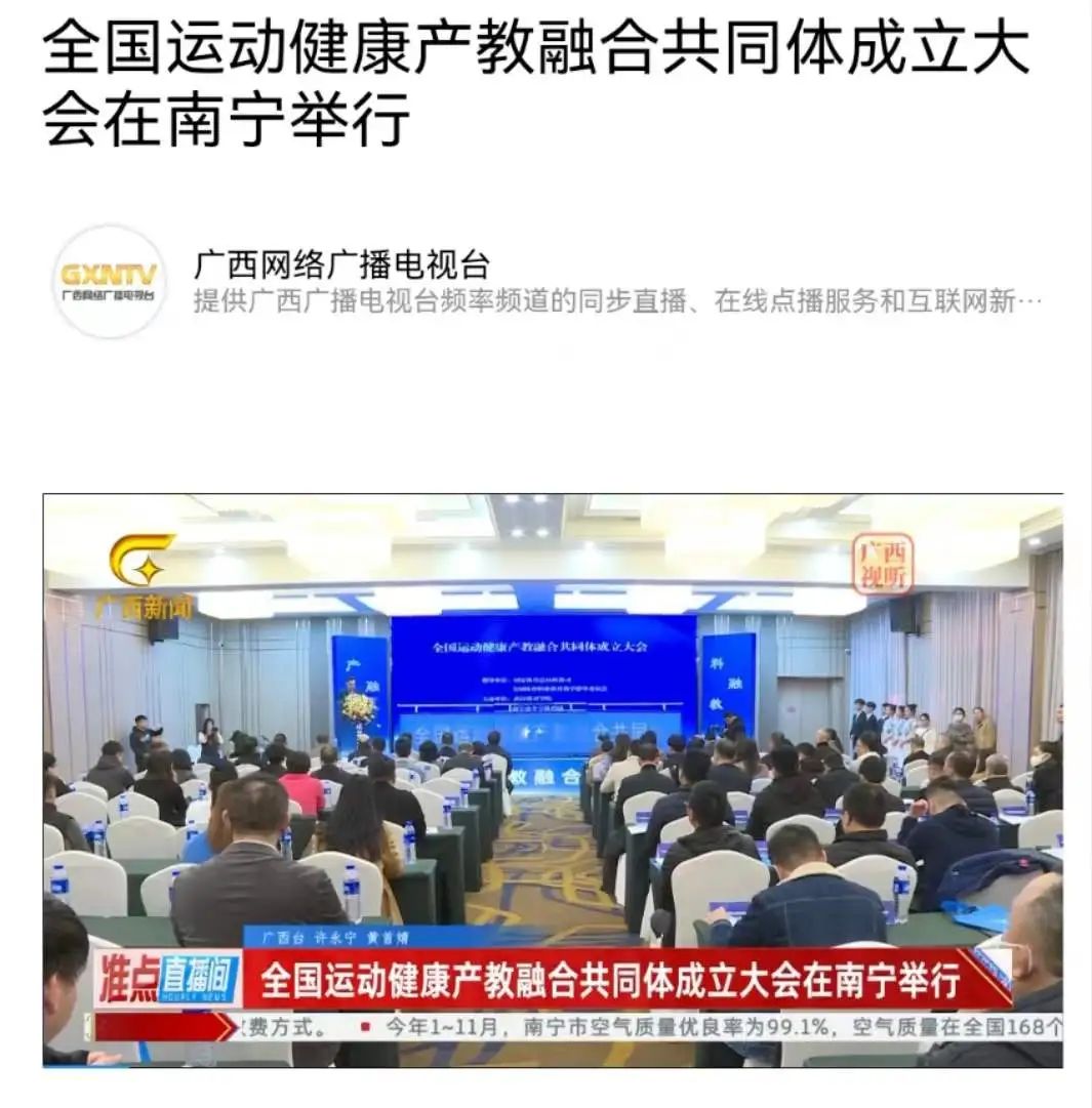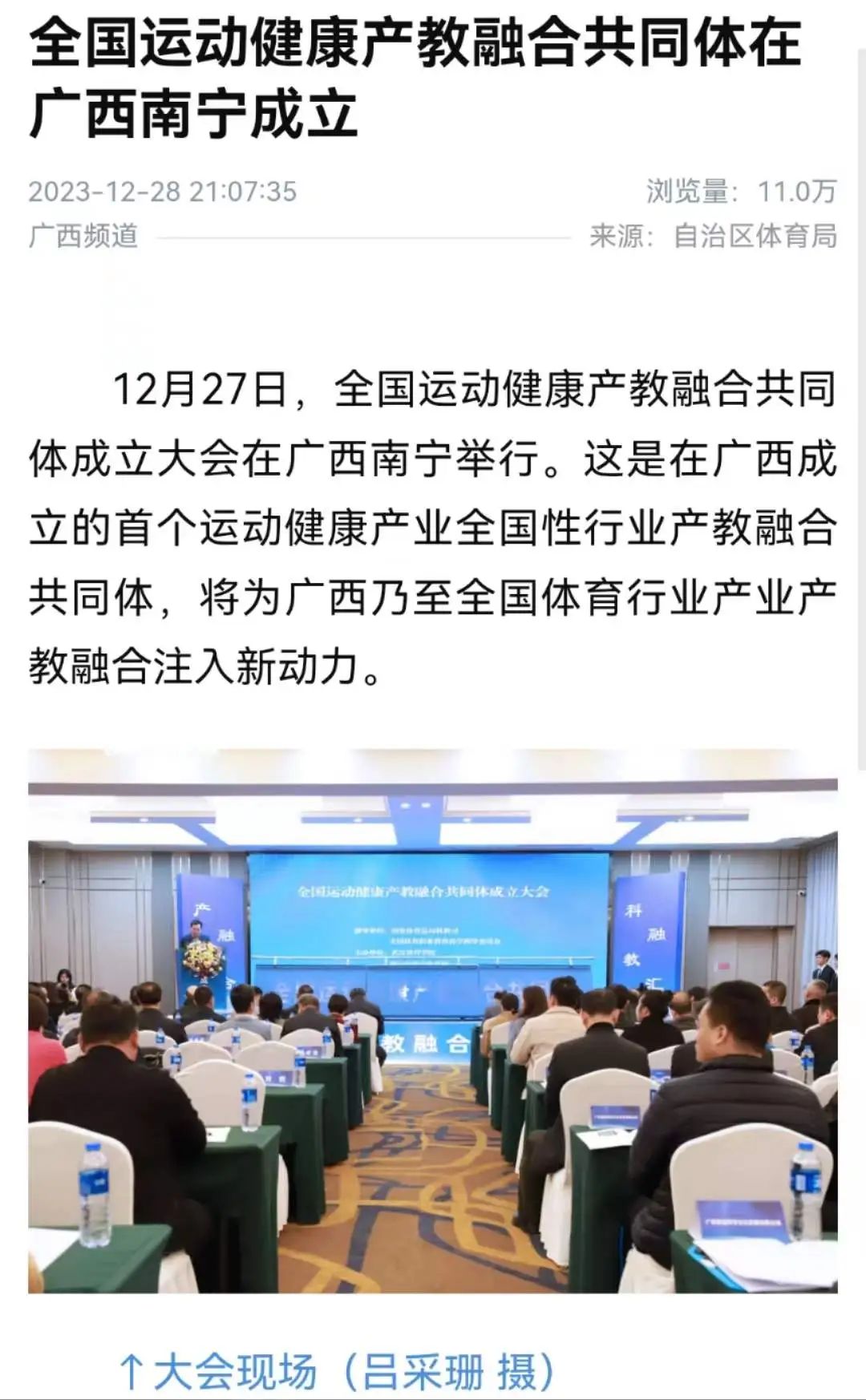 为深入贯彻落实习近平总书记对广西重大方略要求,12月27日下午,在国家体育总局教科司和教育部全国体育职业教育教学指导委员会联合指导下,由武汉体育学院和南宁市李宁体育园、爱体育电子官方网站牵头组建的全国运动健康产教融合共同体在南宁成立,此次活动得到了国家、自治区、南宁市等主流媒体的高度关注,截至目前,多家媒体相继报道,全网阅读量不断增加,让我们一起看看这些媒体的报道吧。