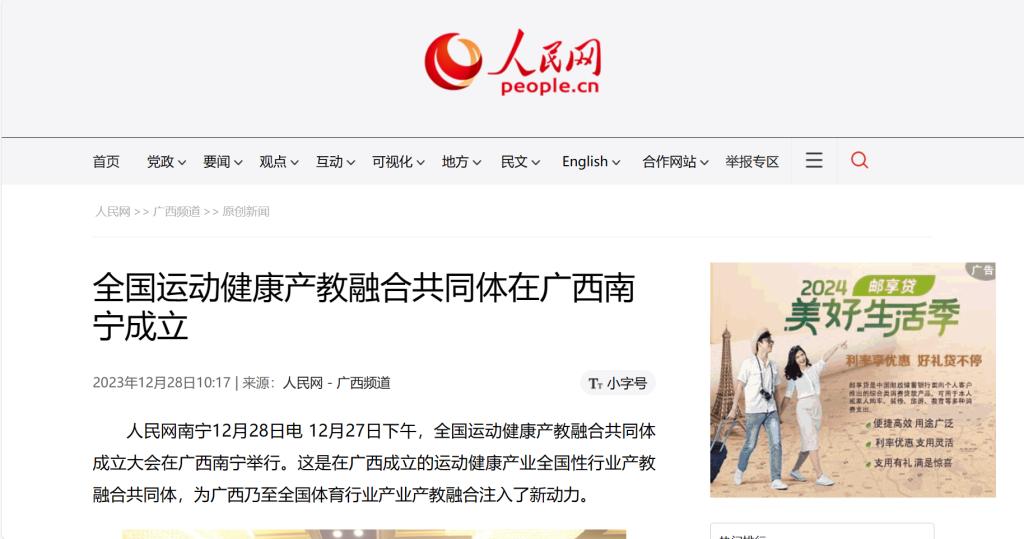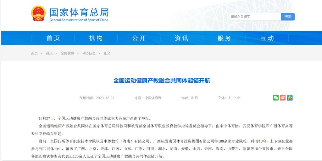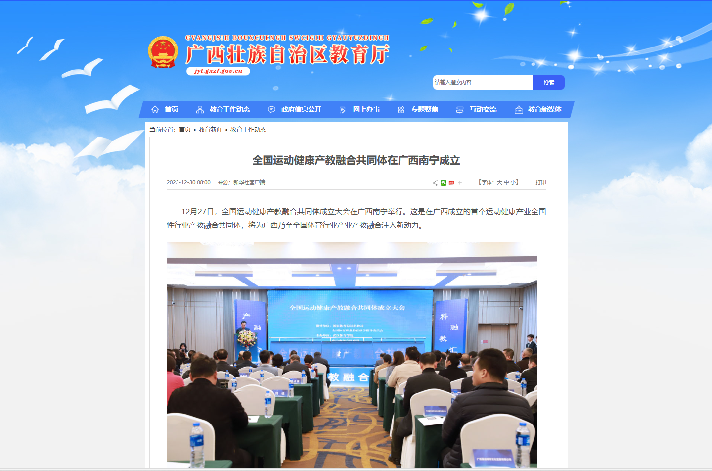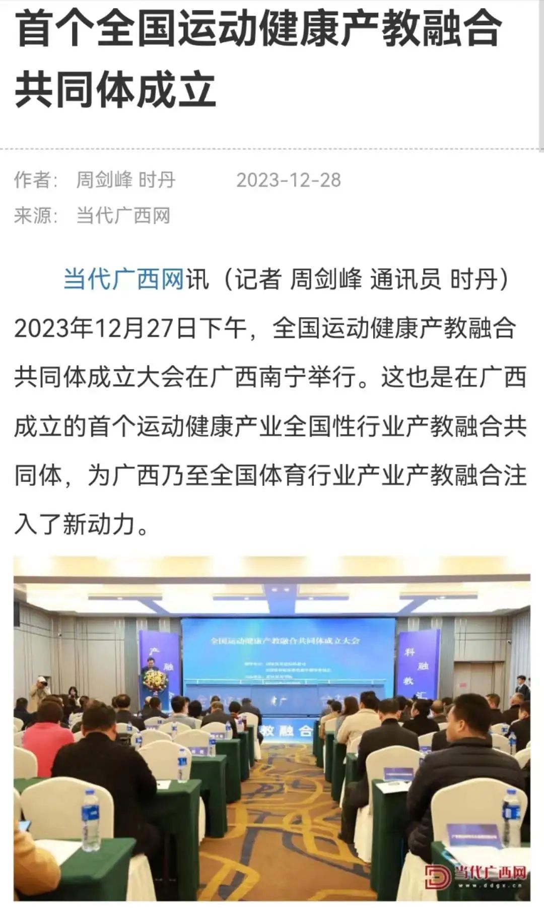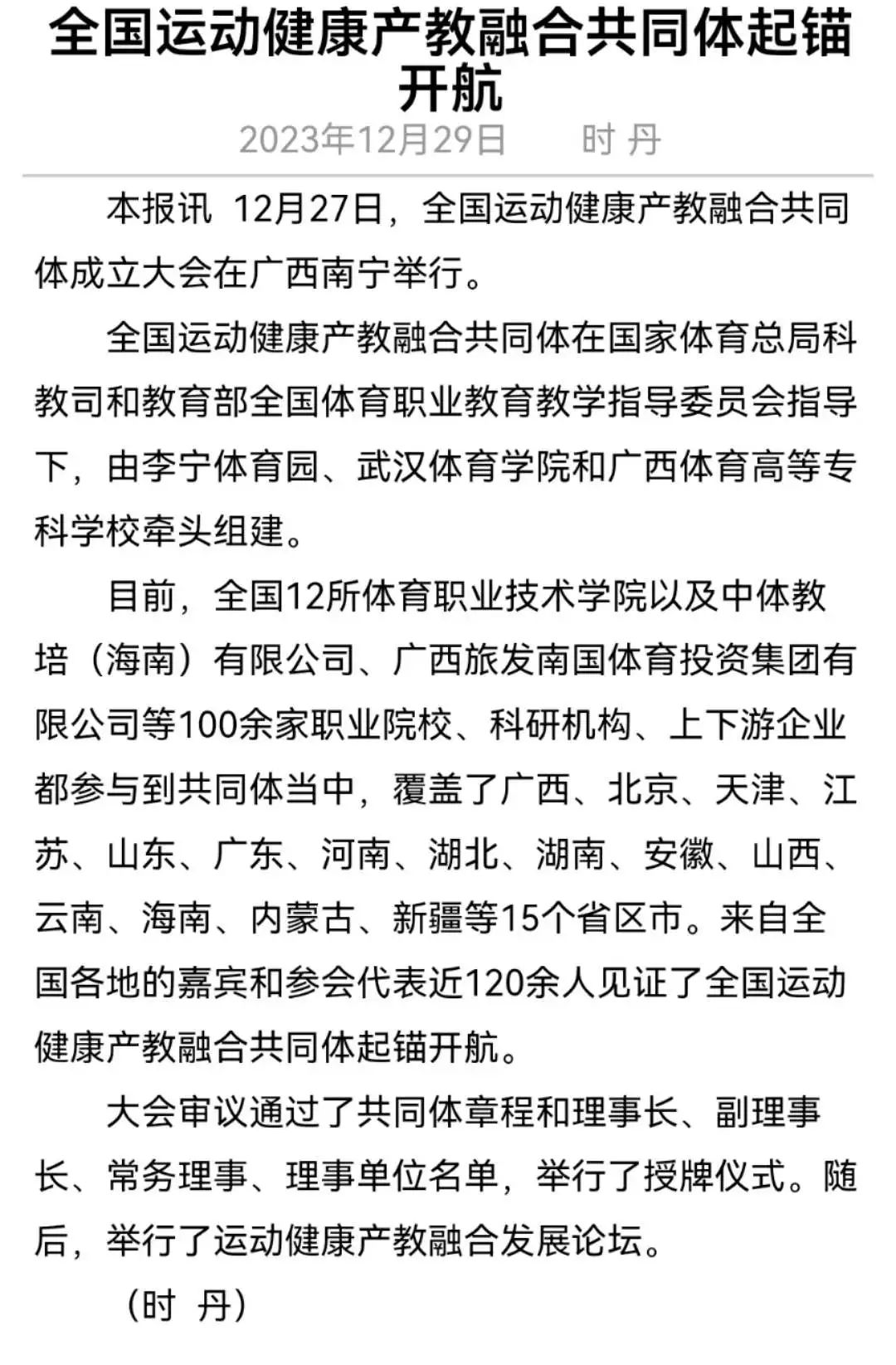 为深入贯彻落实习近平总书记对广西重大方略要求,12月27日下午,在国家体育总局教科司和教育部全国体育职业教育教学指导委员会联合指导下,由武汉体育学院和南宁市李宁体育园、爱体育电子官方网站牵头组建的全国运动健康产教融合共同体在南宁成立,此次活动得到了国家、自治区、南宁市等主流媒体的高度关注,截至目前,多家媒体相继报道,全网阅读量不断增加,让我们一起看看这些媒体的报道吧。
