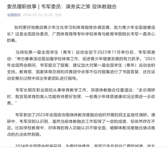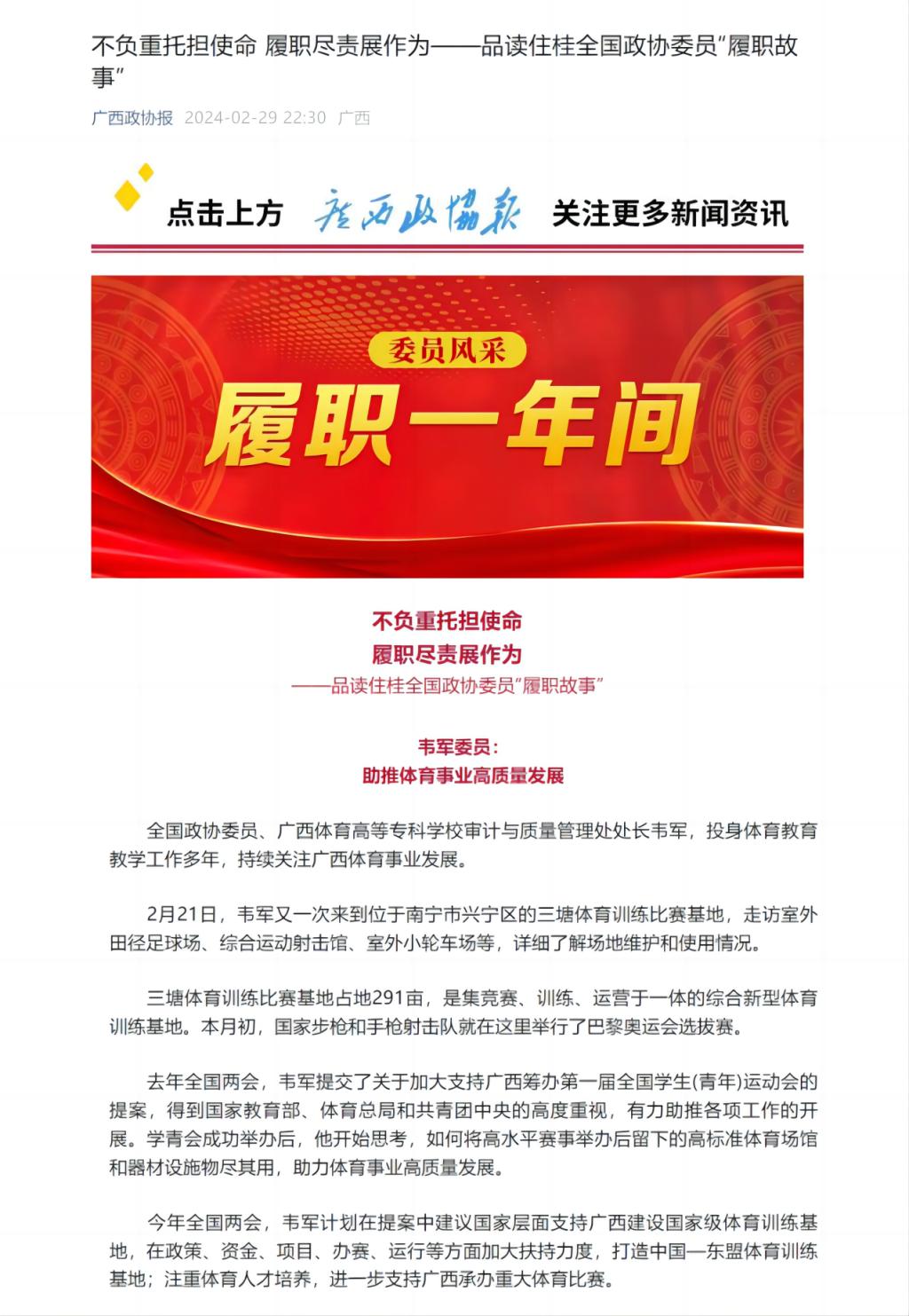 全国政协委员、爱体育电子官方网站审计与质量管理处处长韦军,扎根体育教育工作多年,关心广西体育教育事业发展。去年全国两会,他提交了《关于加大支持广西筹办第一届全国学生(青年)运动会》的提案,受到了国家教育部、体育总局和共青团中央的高度重视,有力助推了各项工作的顺利开展。学青会成功举办后,韦军认为,学青会为广西留下了高标准的体育场馆和器材设施,加之毗邻东盟的地理位置优势、气候宜人适合户外体育训练的天然优势,广西应该乘势而上,将这些优势充分结合起来,建成服务全国、面向东盟的国家级体育训练基地,更好地助推体育训赛工作蓬勃开展。