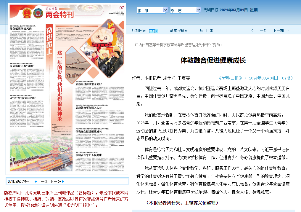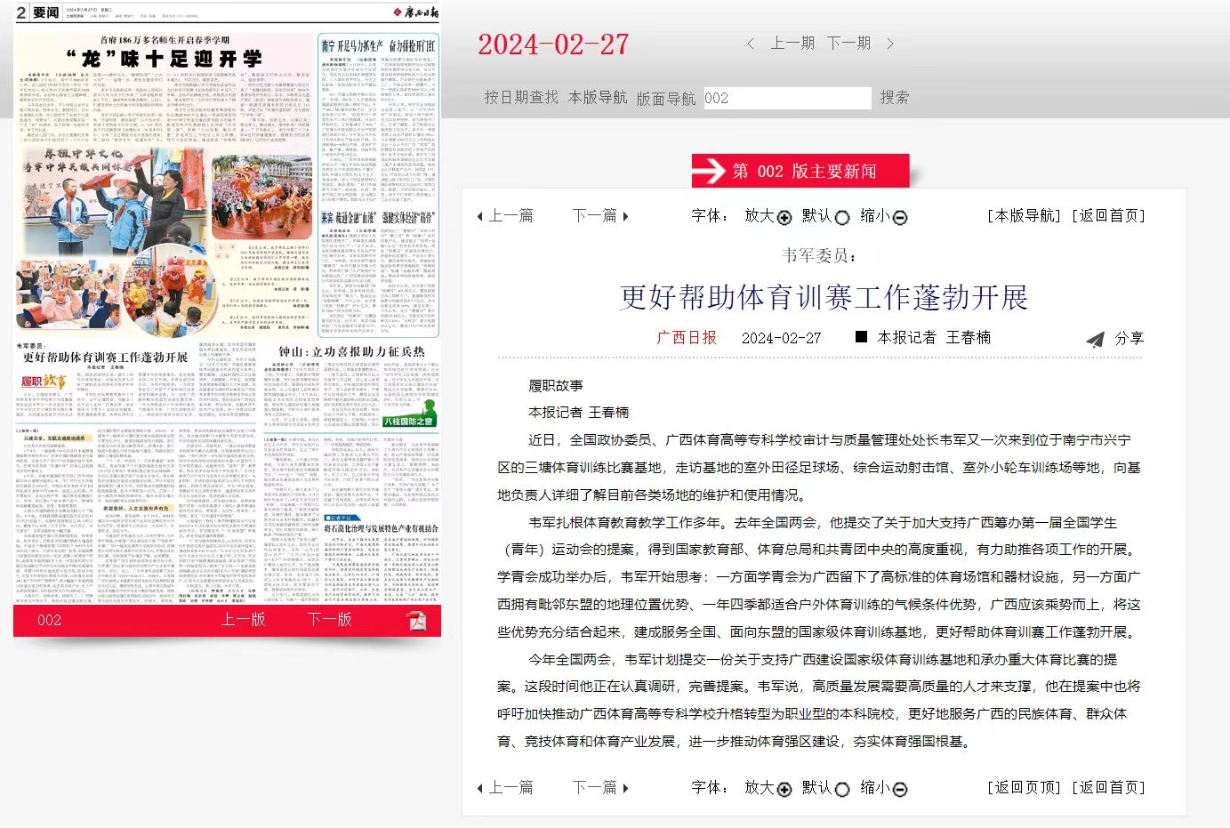 今年全国两会,韦军计划提交一份《关于支持广西建设国家级体育训练基地和承办重大体育比赛的提案》,这段时间他正在认真调研以完善提案。韦军说,高质量发展需要高质量的人才来支撑,他在提案中也将呼吁加快推动爱体育电子官方网站升格转型为本科院校,以便更好地服务广西的民族体育、群众体育、竞技体育和体育产业发展,进一步推动体育强区建设,夯实体育强国根基。