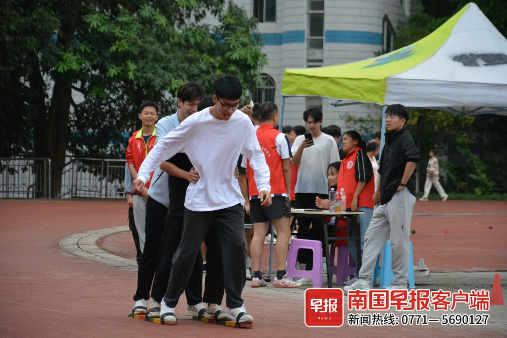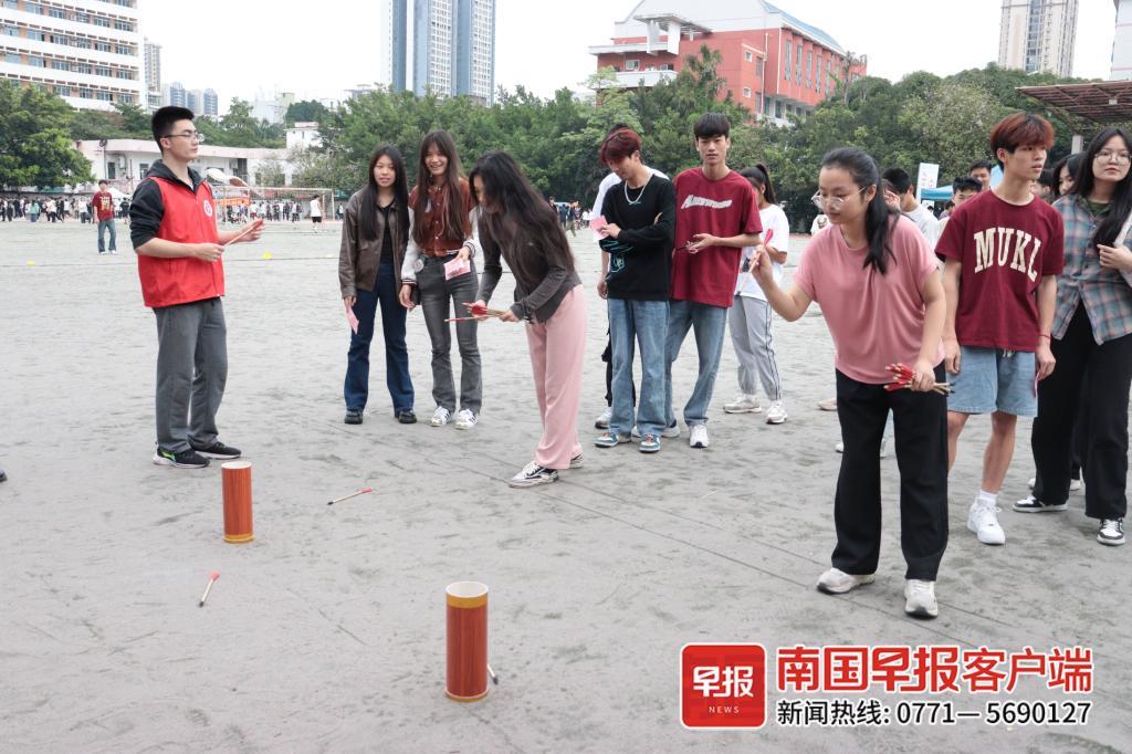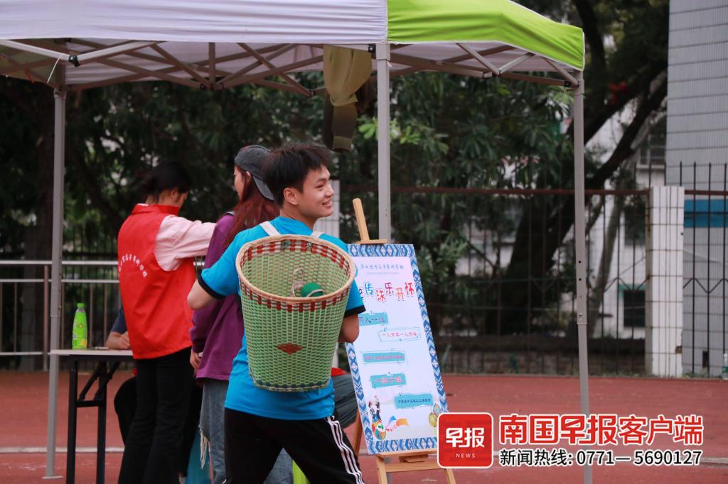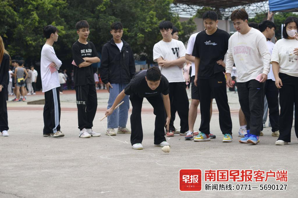 简短的开幕式后,同学们踊跃参加“三月三”民族传统文化体验展示系列活动。民族传统体育体验区设有背篓传绣球、打陀螺、三人板鞋、投壶、踢毽子和滚铁环等民族体育项目;民俗特色文化体验区设有描绘壮美广西DIY团扇及书签、杆舞飞扬、赶歌圩、尝美食等独具民族特色的活动。现场锣鼓喧天,气氛热烈,同学们沉浸在喜悦之中。