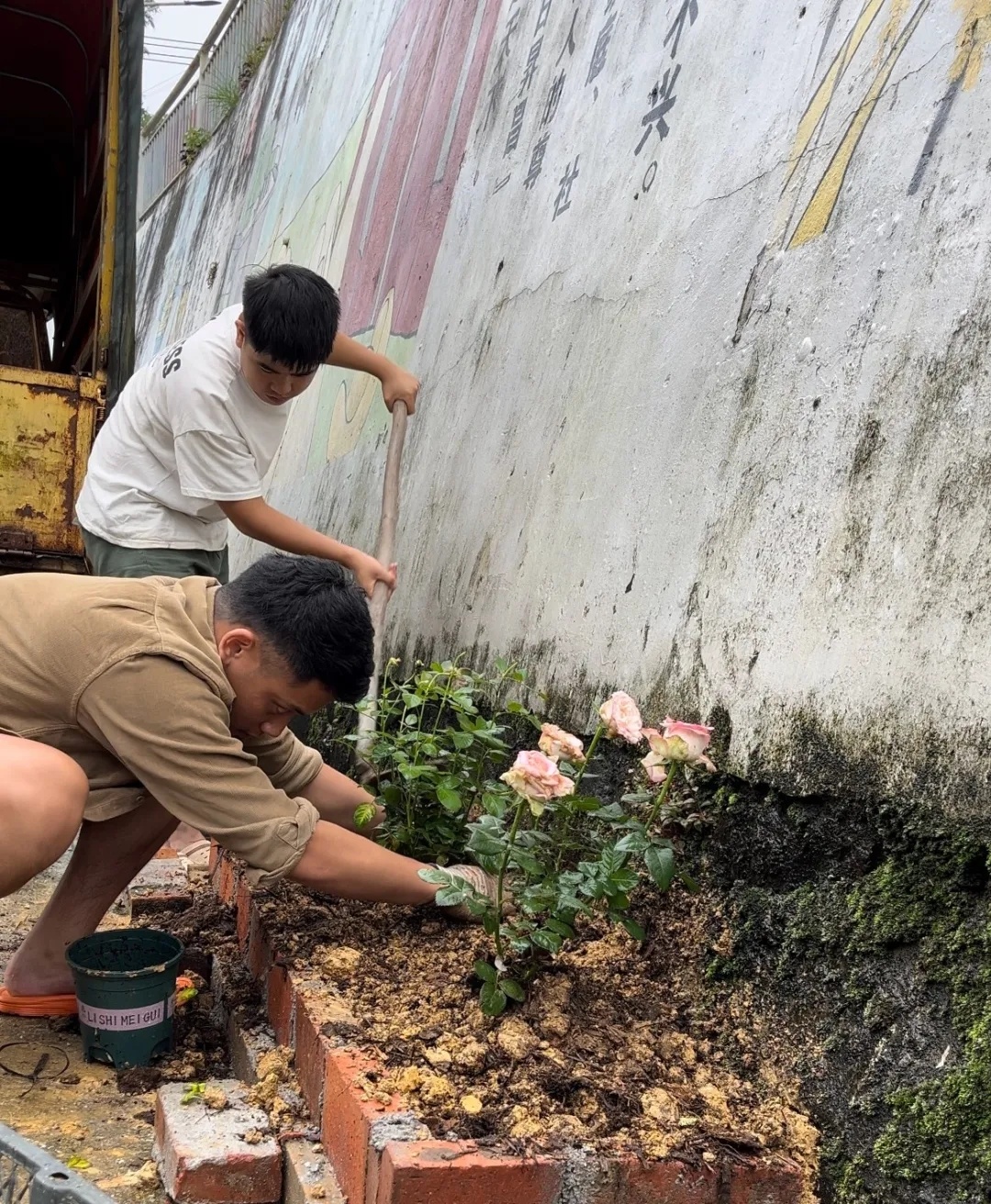 近日,在广西壮族自治区柳州市融水苗族自治县怀宝镇东水村村委路边,常见到两个青年人拿着铁铲搅拌砂石水泥,在路边水沟上搭建起一个个花圃,引来村民驻足围观。大家好奇地询问:“你们在做什么哦?”一个青年回答:“美化环境呀,这样拍小视频效果好点。”