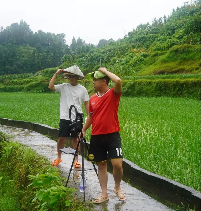 原来,这两位是回乡创业青年何锦、梁达聪,他们以“大山乐农兄弟”的网名在抖音平台上持续推出乡村生活题材小视频。近两个月来,东水村民经常看到这两个后生仔拿着三脚架和劳动工具出现在村头巷尾、田间地头拍摄视频,有时还邀请路过的老乡出镜。美化家乡的行为、清新淳朴的乡村画面以及青年返乡创业的艰辛引起大家的乡愁共鸣,吸引周边网民关注,获得越来越多的点赞。