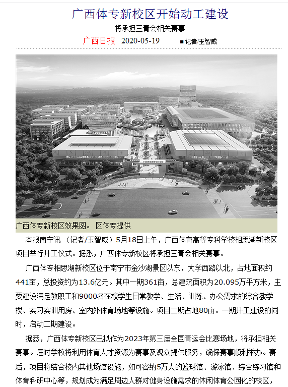 据悉,广西体专新校区已拟作为2023年第三届全国青运会比赛场地,将承担相关赛事。届时爱体育(中国)将利用体育人才资源为赛事及观众提供服务,确保赛事顺利举办。赛后,项目将结合校内其他场馆设施,如可容纳5万人的篮球馆、游泳馆、综合练习馆和体育科研中心等,规划成为满足周边人群对健身设施需求的休闲体育公园化的校区,并探索建立中国-东盟体育人才培养基地和中国-东盟运动康养中心等。