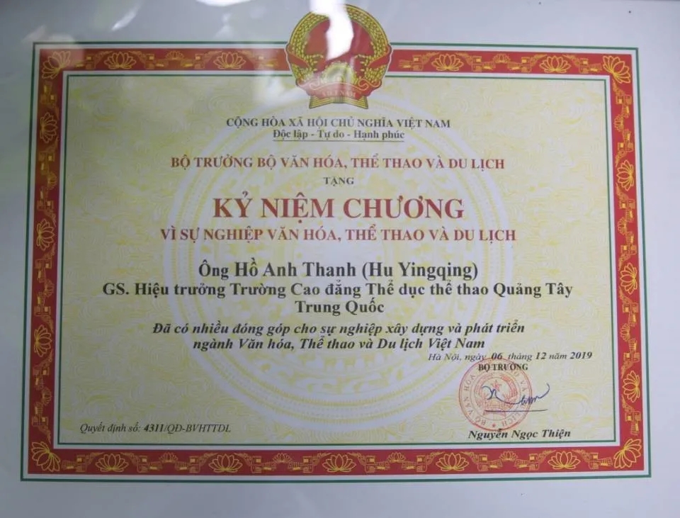 爱体育电子官方网站胡英清校长荣获“对越体育事业贡献奖”