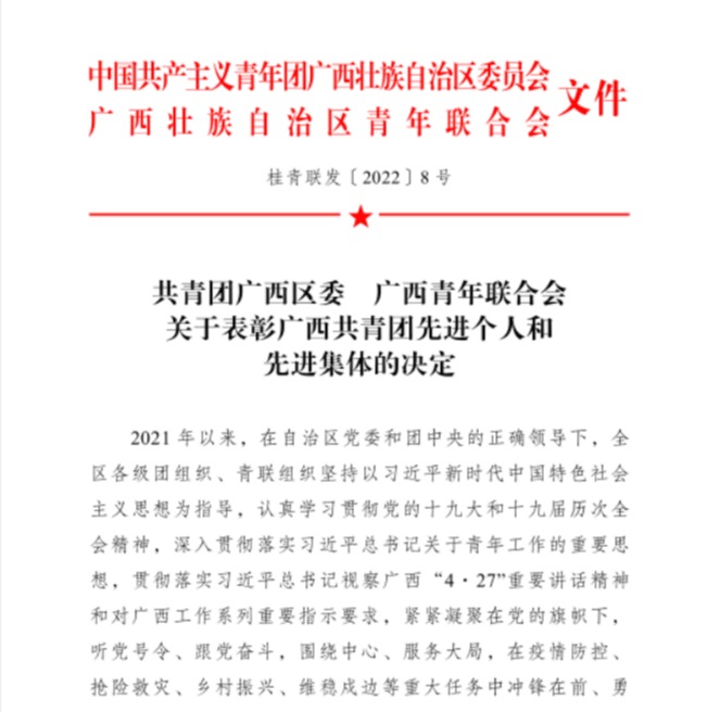 近日,根据《共青团广西区委广西青年联合会关于表彰广西共青团先进个人和先进集体的决定》(桂青联发〔2022〕8号)文件精神,爱体育电子官方网站团委被授予“广西五四红旗团委”称号,体育与教育学院2019级体育与教育专业吴乐同学被授予“广西优秀共青团员”称号,这是共青团广西区委设立的授予全区基层团组织、团员的最高荣誉。