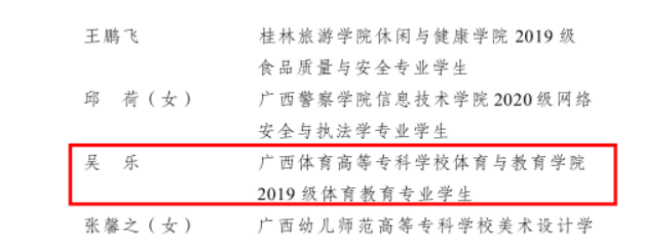体育与教育学院2019级体育与教育专业吴乐同学被授予“广西优秀共青团员”称号