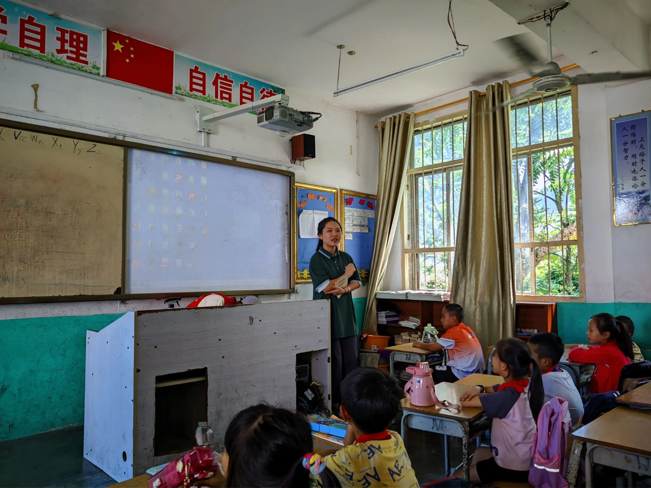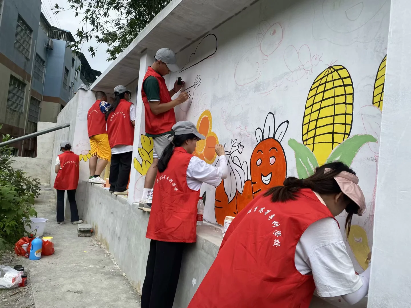 第三天,志愿服务队开展了“我为村里做件事,绘画黑板报”活动。志愿者们来到加方中心小学的农作物基地,化身“粉刷匠”,手持刷子、颜料板,勾轮廓、上颜色,反复打磨、勾勒细节,在空墙面上画上了彩色的墙绘,为乡村增添一抹青春色彩。