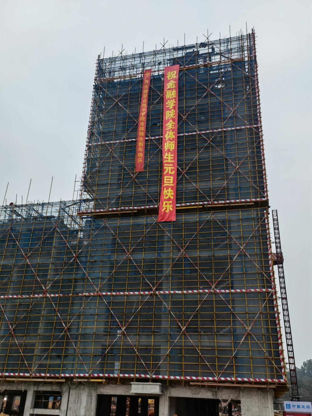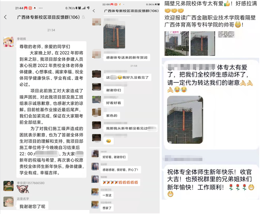 2021年12月31日,项目桩基作业接近尾声之际,在辞旧迎新之时,爱体育电子官方网站相思湖校区项目施工单位及劳务班组分别在项目最高建筑行政办公楼西侧悬挂巨型新年横幅,感谢金职院全体师生对项目的理解和支持,并送上诚挚的新年祝福。金职院师生也纷纷在社交媒体上称赞和表示感谢,感谢体专项目在冬季严寒中送来的温馨。