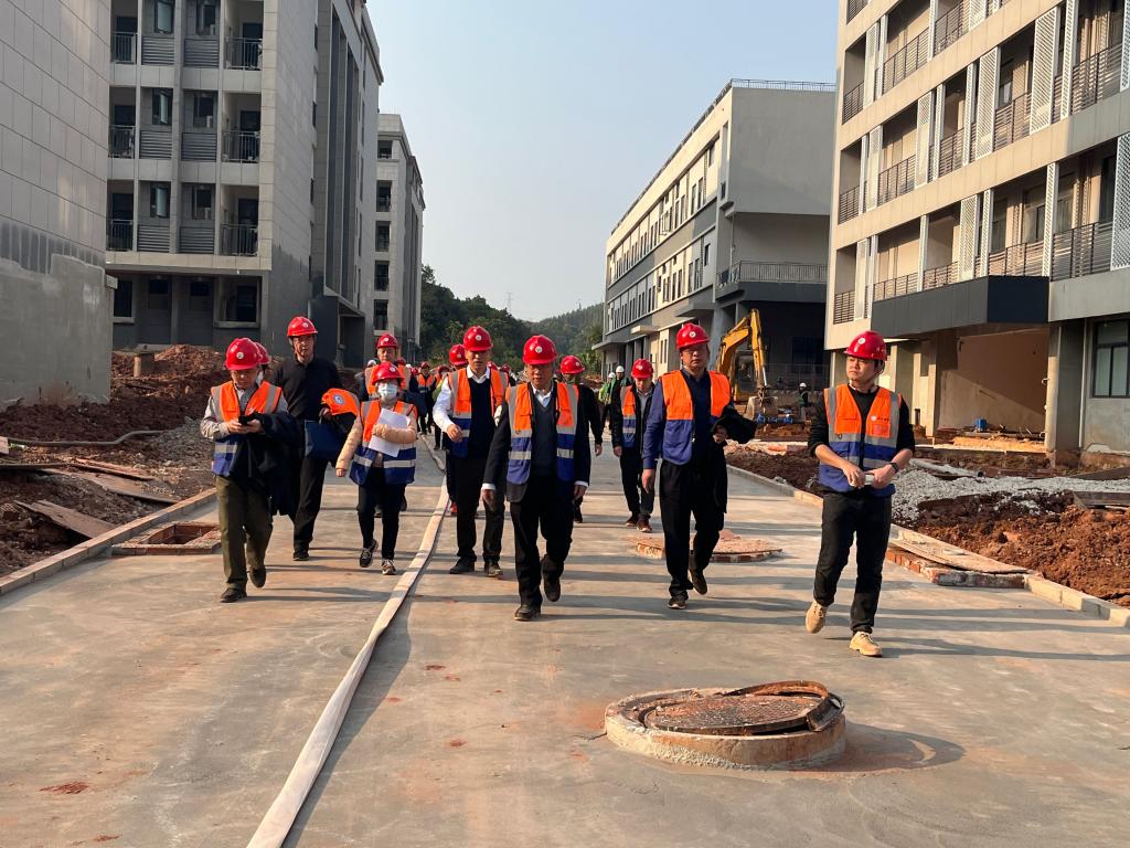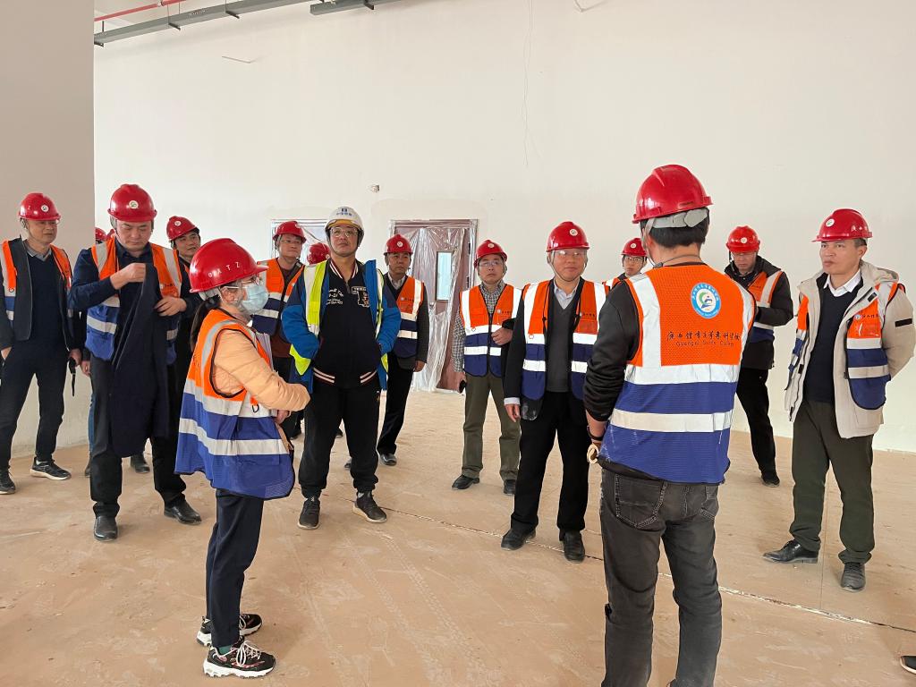 杨昌鹏书记一行先后进入项目篮球馆、综合训练馆、学生活动和体质检测中心、行政办公和科技实训楼、学术交流中心、图书馆、食堂等单体,详细了解各功能用房布局及现场实施情况。