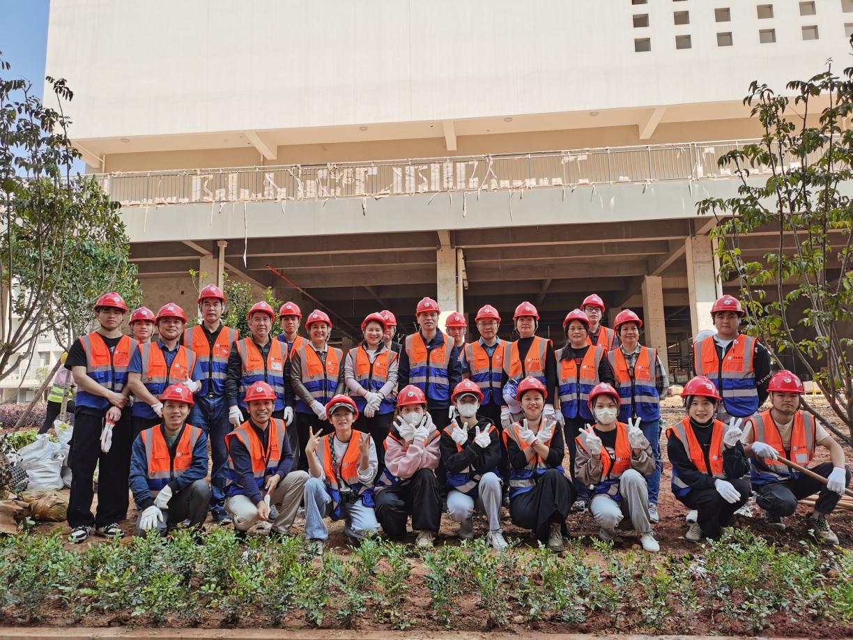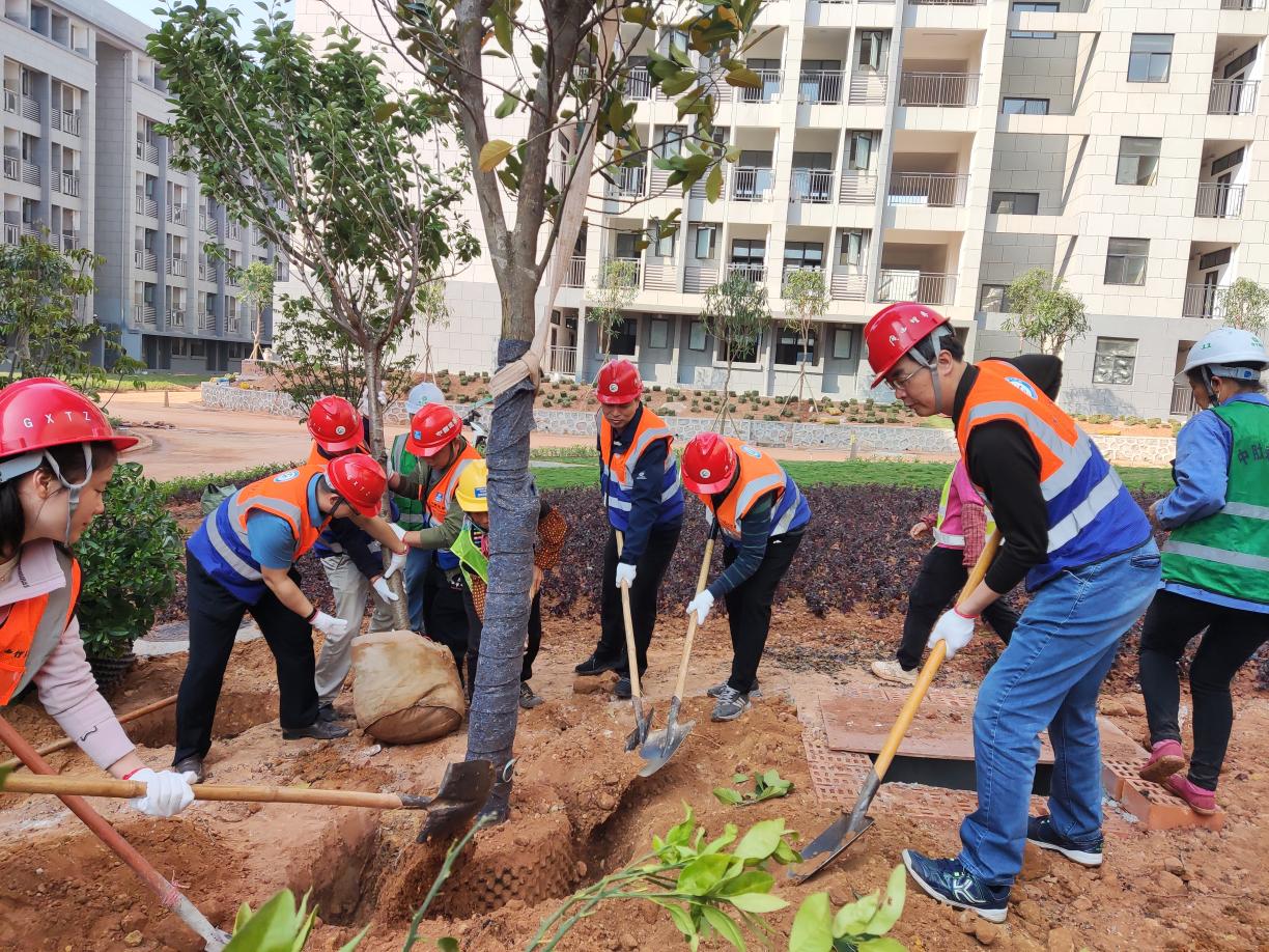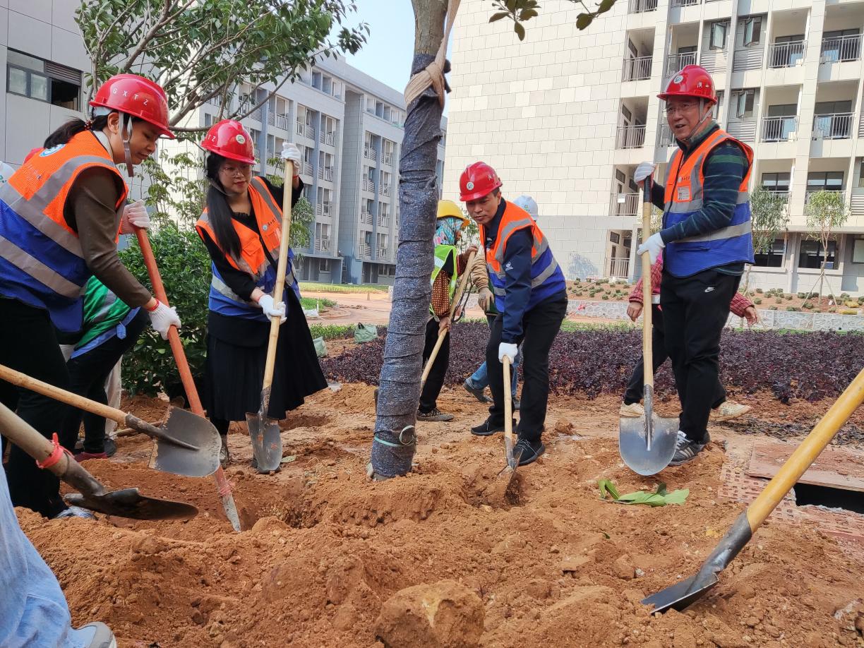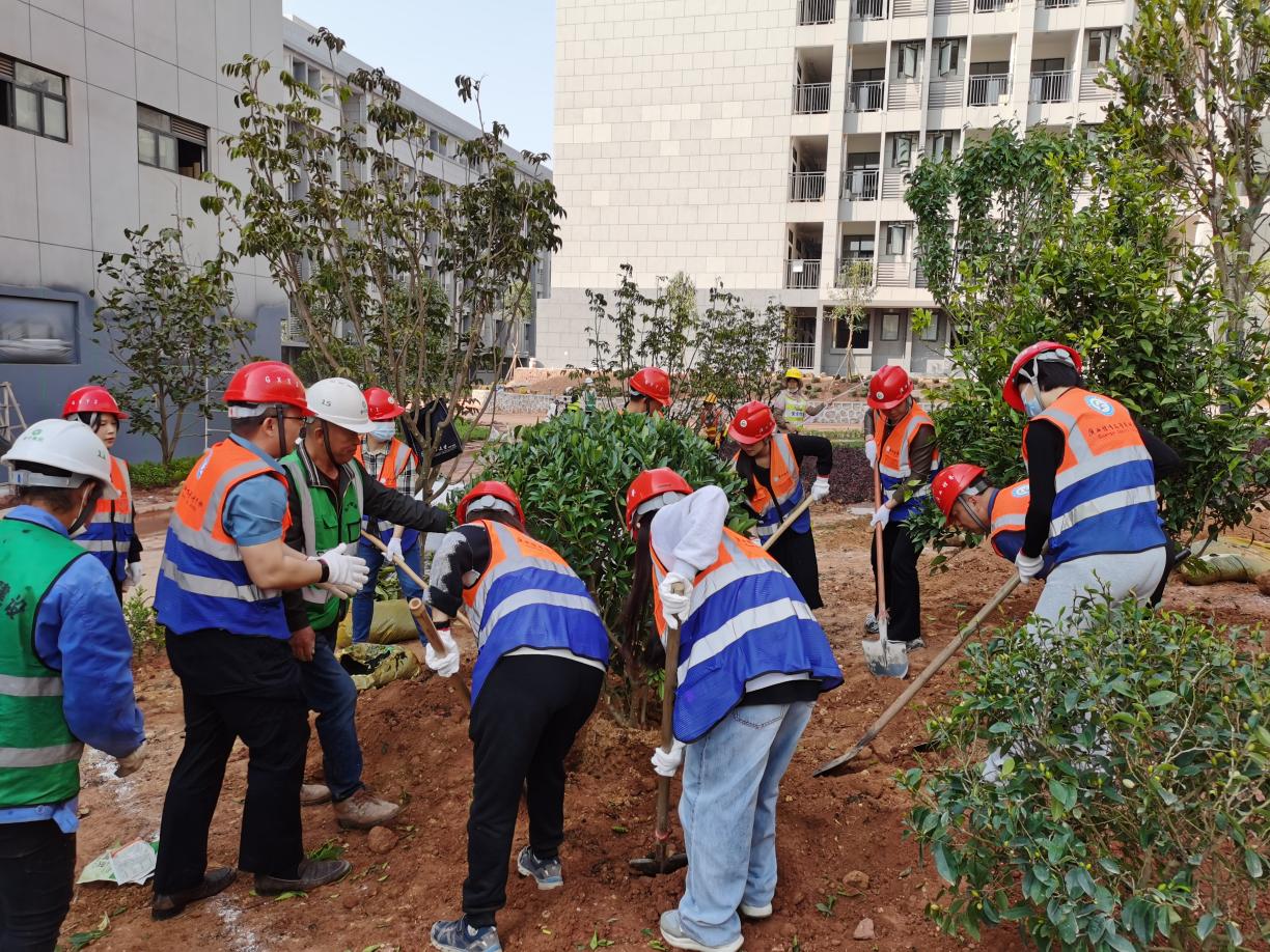 罗黎造书记一行对新校区施工工地进行徒步视察,了解项目的建设推进情况,对项目取得的进展表示肯定,也对项目如期建成投入使用表示期望。随后来到教学楼北侧开展植树活动。现场,全体人员热情高涨、干劲十足,在园建人员的指导下,随机分组开始植树。大家挥锹铲土、放入树苗、填土压实,道道工序细致认真、有条不紊,一派繁忙有序、热火朝天的景象。