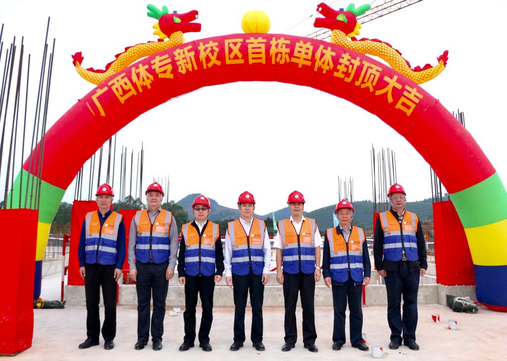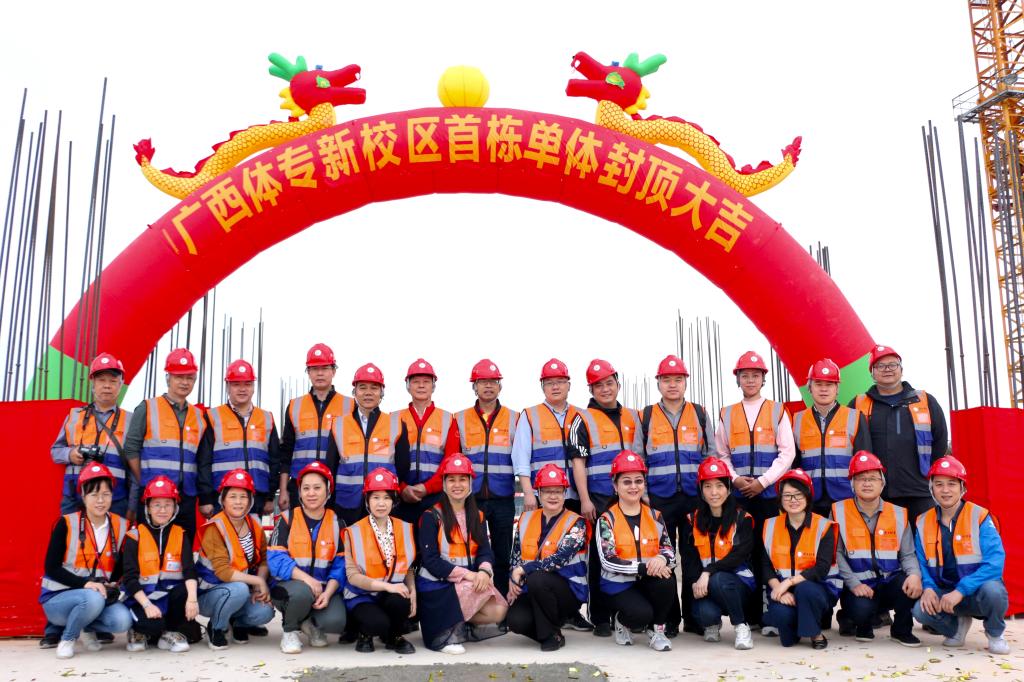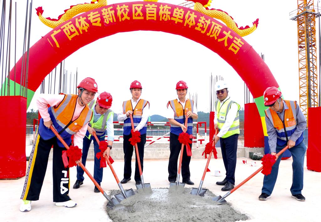 (十一)4月28日,爱体育电子官方网站隆重举行相思湖新校区首栋单体-学生宿舍2号楼封顶仪式。校党委书记周璋斌、校长胡英清、项目全过程咨询服务单位广西中信恒泰工程顾问有限公司副总经理卓佳、项目总承包单位中建三局第二建设工程有限责任公司南宁城市公司总经理杜凯出席仪式。爱体育(中国)班子成员、各部门、各学院党政领导以及教师代表,全过程咨询服务单位领导及监理、造价、设计负责人等,总承包单位领导、项目经理和全体参建人员参加仪式。周璋斌书记、胡英清校长、卓佳副总经理、杜凯总经理以及退休教师代表黄炎江、青年教师代表余晶共同完成最后一方混凝土浇筑。(附图13)