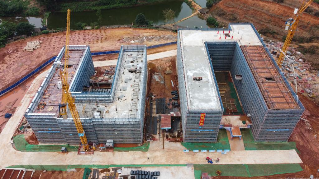 (二)完成1#宿舍楼北面四层结构板砼浇筑,南面五层结构板支模架体搭设完成70%。完成教学楼基础回填土。(附图2)