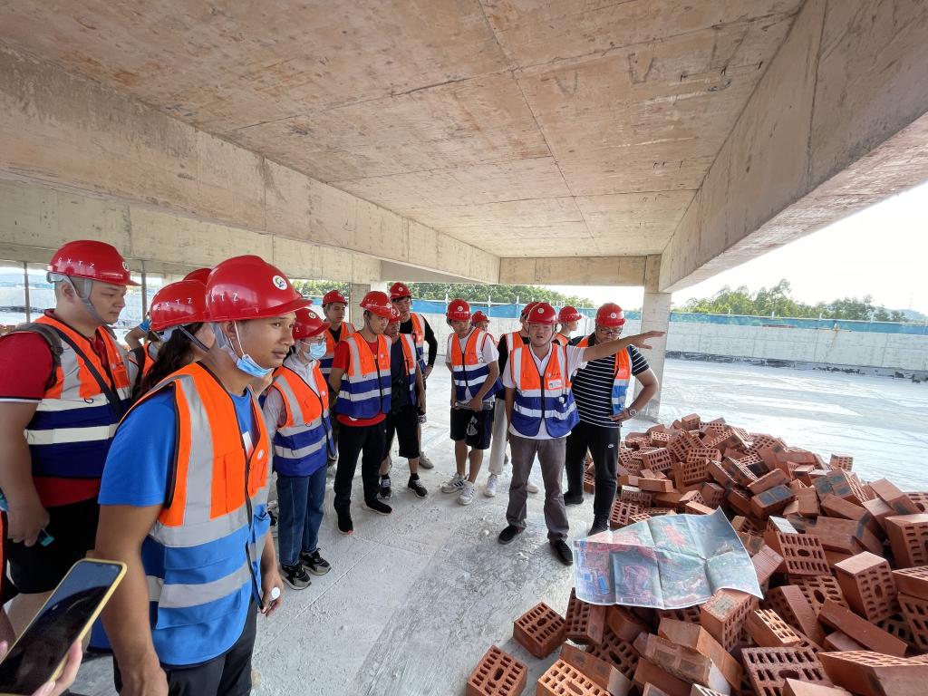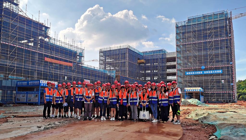 座谈会后,全体人员前往项目工地现场参观,并到2#宿舍楼楼顶观看整个项目工地全貌,新校区办副主任黄民睿对项目的规划及设计进行现场讲解。体教学院教师们对新校区的建成及投入使用都充满期待,表示将努力做好本职工作,为新校区尽快建成投入使用共同努力。