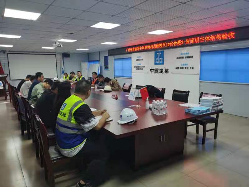 验收组由建设单位、设计单位、监理单位和施工单位组成。经现场实体感观、实测实量检查,以及质量控制、安全和功能检验资料检查后,验收组在项目施工部第一会议室召开总结会,经项目施工单位对图施工、质量标准、质量保证资料等完成度进行自评,各检查分组负责人分别汇报工程质量情况和验收意见后,验收组一致同意项目1#宿舍楼2-6层主体结构分部工程通过验收,同时要求对本次验收中发现问题进行限时整改。会上,南宁高新技术产业开发区建设工程质量安全服务站负责人表示此次验收的主体结构分布工程质量优良,认可本次验收结果,并对现场存在部分问题进行点评,督促施工单位尽快落实相关整改措施。