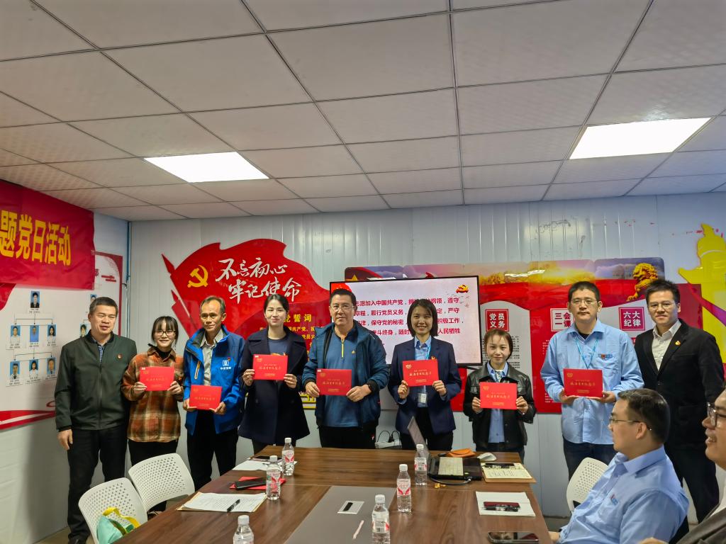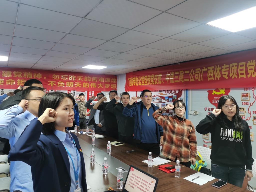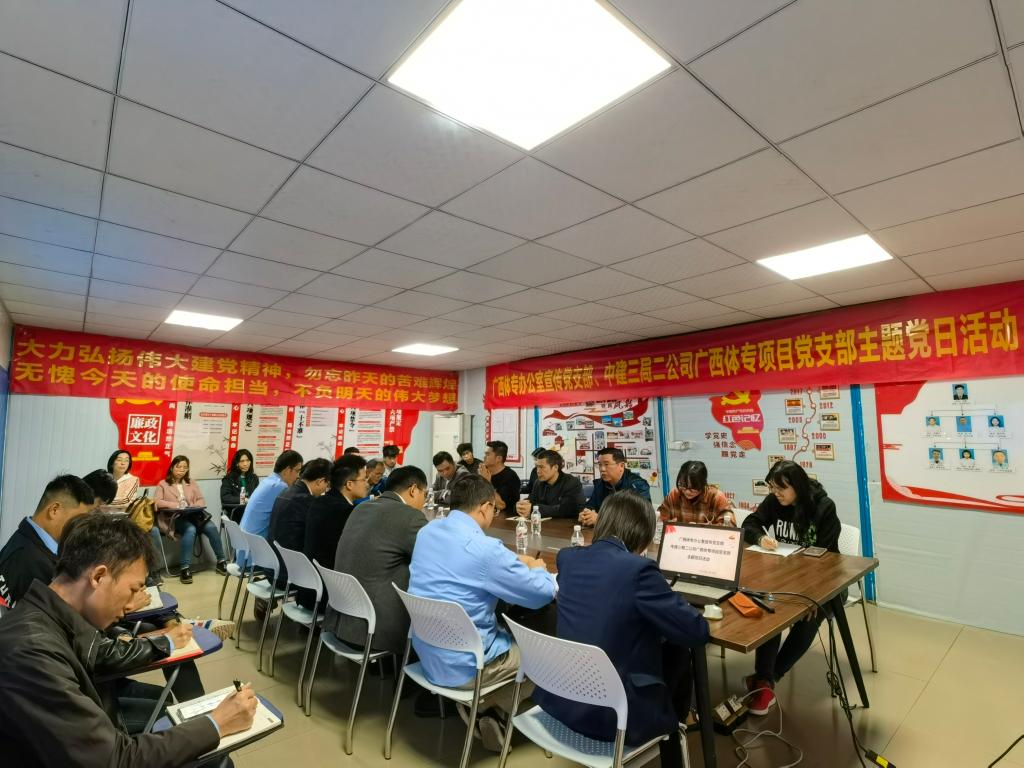为了贯彻学习党的十九届六中全会精神,发挥党建引领作用,助推项目加速发展,11月30日上午,广西体专办公室宣传党支部与中建三局二公司广西体专项目党支部在相思湖校区项目工地联合开展主题党日活动,为7-12月入党的党员过“政治生日”。广西体专办公室宣传党支部、项目全过程咨询公司及总承包单位项目支部党员代表、发展对象及积极分子共计23人参加活动。