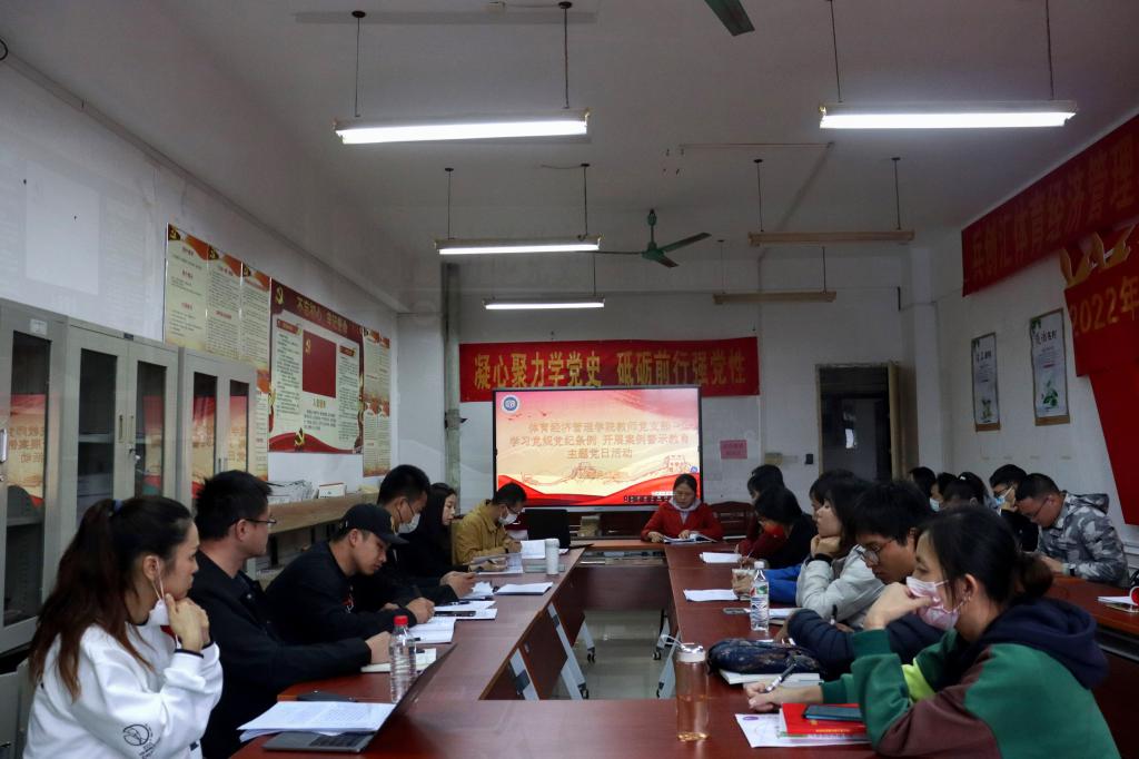为推动“清廉体专”建设,进一步加强广大党员干部的遵纪守法意识,体育经济管理学院教师党支部于11月30日在长岗校区瑞兴楼422党员活动室开展“学习党规党纪 开展案例警示教育”主题党日活动。活动由教师党支部书记方安院长主持,全体党员教师参加。