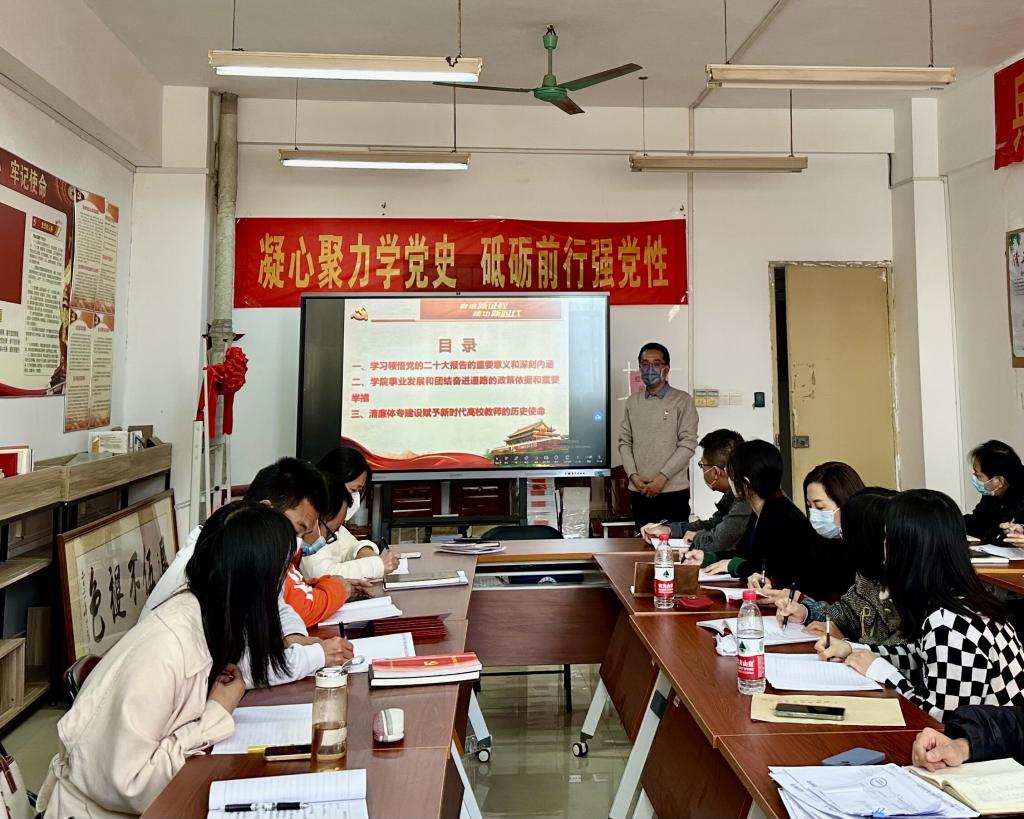 方安院长以“自信扬旗帜 奋进新征程”为题,重点解读了“学习领悟党的二十大报告的重要意义和深刻内涵、学院事业发展和团结奋进道路的政策依据和重要举措、清廉体专建设赋予新时代高校教师的历史使命”三个方面的内容,并结合当前广西的发展机遇和学院的发展实际,鼓励各党支部要带领学院全体老师践行“三个敢于”:敢于自我革命,发扬照镜子精神,反思和改进不足;敢于亮剑,开展批评和自我批评,不断寻求进步;敢于接受挑战,勇挑重担,担当有为,不负韶华。希望老师们要不忘初心、牢记使命,弘扬伟大建党精神,以自信自强、守正创新、踔厉奋发、勇毅前行的昂扬精神,践行“明德至诚 健行致远”的校训,走好新时代赶考之路。