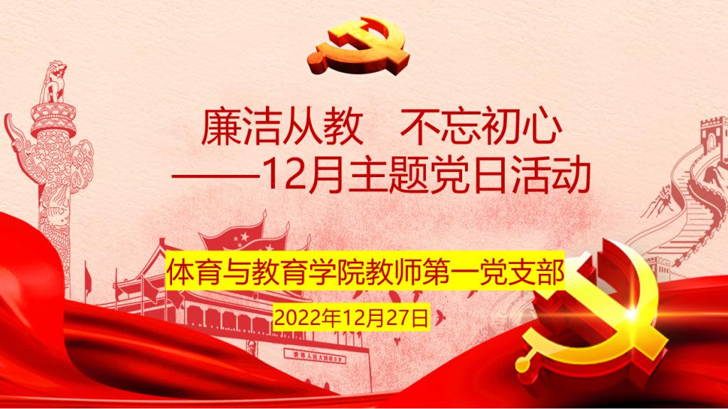 为推动“迎接二十大、做合格党员”系列活动走深走实,12月27月,体育与教育学院教师第一党支部线上召开“警示教育筑防线 廉洁自律守初心”主题党日活动,进一步增强全体党员遵纪守法和廉洁自律意识,筑牢拒腐防变思想防线。
