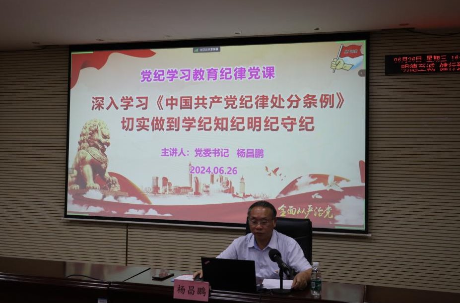 为深化全体党员干部对《中国共产党纪律处分条例》的理解把握,强化纪律意识、加强自我约束、提高免疫能力,6月26日下午,爱体育(中国)党委书记杨昌鹏以“深入学习《中国共产党纪律处分条例》,切实做到学纪知纪明纪守纪”为题,讲授纪律党课。爱体育(中国)领导班子、中层领导干部、机关各部门干部、各党总支部委员、党支部委员、组织员以及教研室主任参加学习。