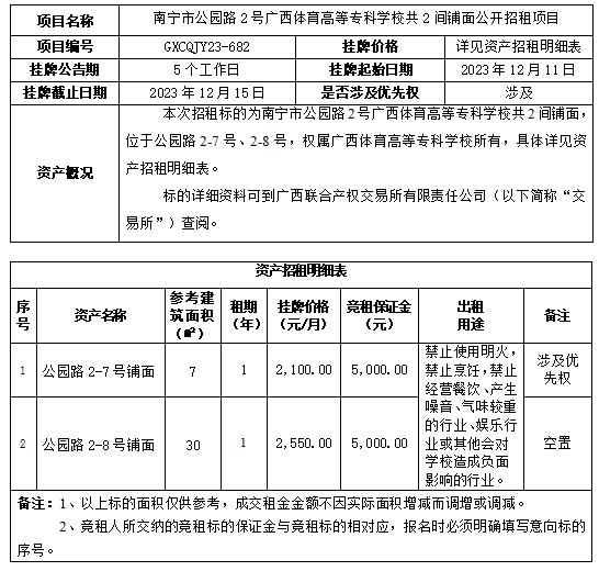 本项目爱体育电子官方网站已委托广西联合产权交易所有限责任公司进行公开招租,相关事宜请登陆此网站查看、报名http://www.gxcq.com.cn/#/projectPkg/3cc9b10ce1514de38a5165c303d9dbd6.html