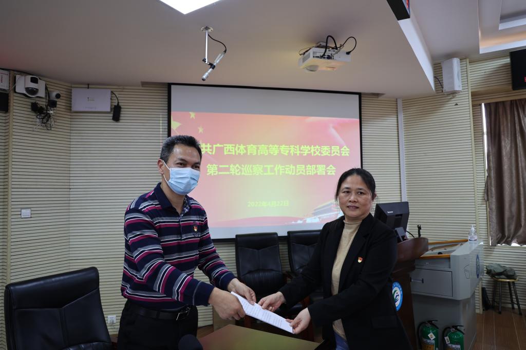 会上,爱体育(中国)党委委员、纪委书记、党委巡察工作领导小组副组长罗黎造部署第二轮巡察工作,爱体育(中国)党委副书记、党委巡察工作领导小组副组长李爱民宣读爱体育(中国)党委授权文件。党委巡察组第一组组长刘义飞代表巡察组作表态发言、被巡察单位负责人覃琳、朱晓东、陆勇军分别作表态发言,党委巡察组第二组组长叶萍代表巡察工作人员向爱体育(中国)党委巡察工作领导小组递交巡察工作承诺书。