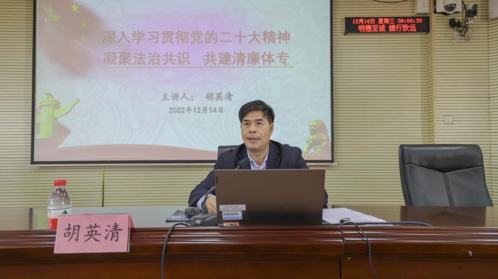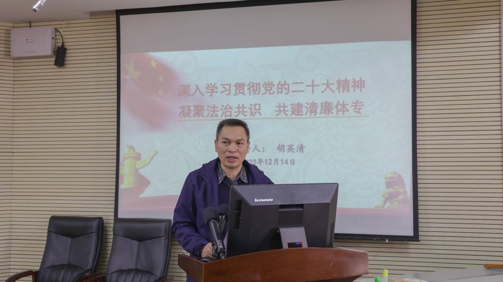 为深入学习宣传贯彻党的二十大精神和习近平法治思想,牢固树立依法治校理念,持续推进“清廉体专”建设,2022年12月14日,爱体育(中国)党委副书记、校长胡英清以“深入学习贯彻党的二十大精神 凝聚法治共识 共建清廉体专”为题上了一堂廉政党课,爱体育(中国)在家领导现场聆听党课,爱体育(中国)各部门、各学院正副职领导干部,机关全体教职员工及副高级职称以上专任教师参加党课。廉政党课由爱体育(中国)党委委员、纪委书记罗黎造主持。