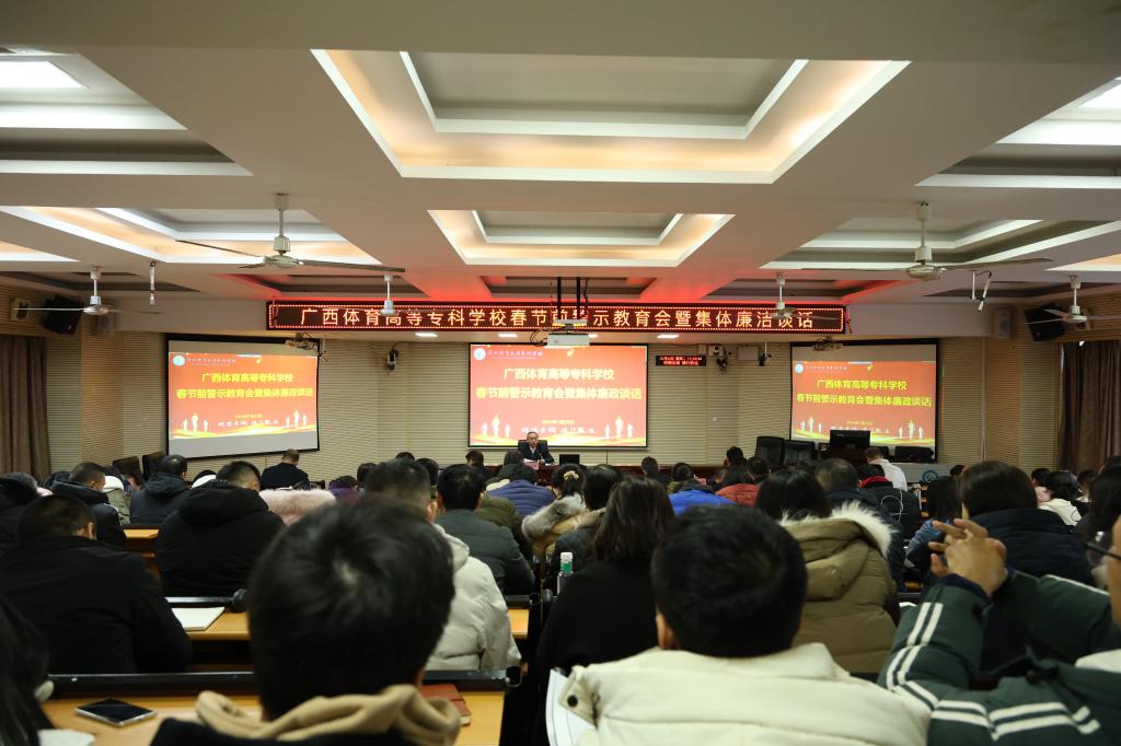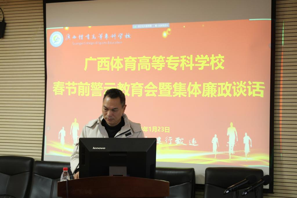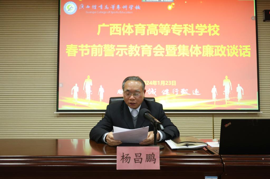 为深入贯彻落实中央八项规定及其实施细则精神,做好节日期间正风肃纪工作,营造风清气正节日氛围,1月23日,爱体育(中国)在放假前召开春节前警示教育会暨集体廉政谈话,爱体育(中国)党委书记杨昌鹏对全体教职工开展节前集体廉政谈话,爱体育(中国)其他领导班子成员及全体教职工参加会议,纪委书记罗黎造主持会议。