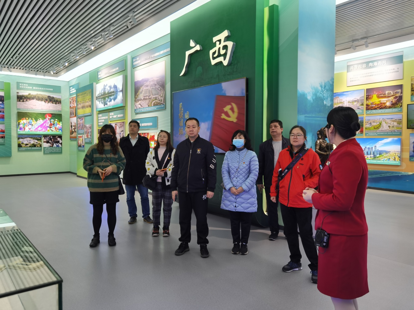 在讲解员的引导下,党员们依次参观了展厅的各个部分,广西单元以“凝心聚力建设新时代中国特色社会主义壮美广西”为主线,分“八桂大地 走向富裕”“民族团结 同心向党”“开放包容 向海而兴”“红色热土 文明法治”“美丽广西 宜居康寿”5个展示部分,50张代表性图片,近30个实物、模型,辅以视频、互动体验等多种展示手段和元素,立体化、多角度呈现广西各族人民努力在推动边疆民族地区高质量发展上闯出新路子,在服务和融入新发展格局上展现新作为,在推动绿色发展上迈出新步伐,在巩固发展民族团结、社会稳定、边疆安安宁上彰显新担当。