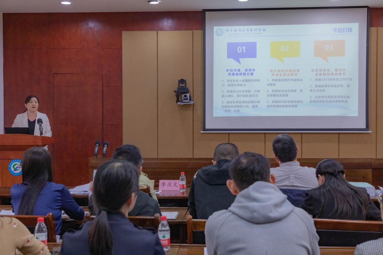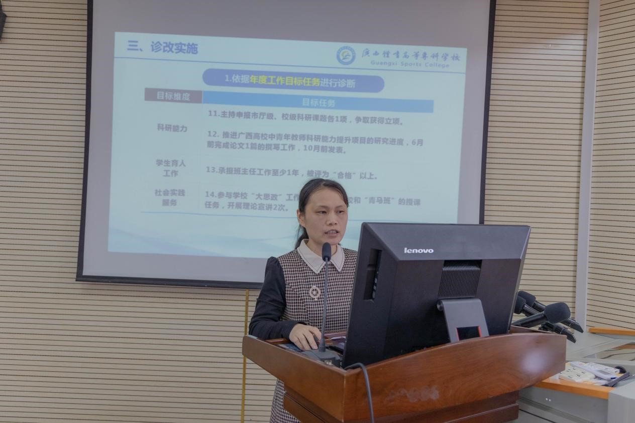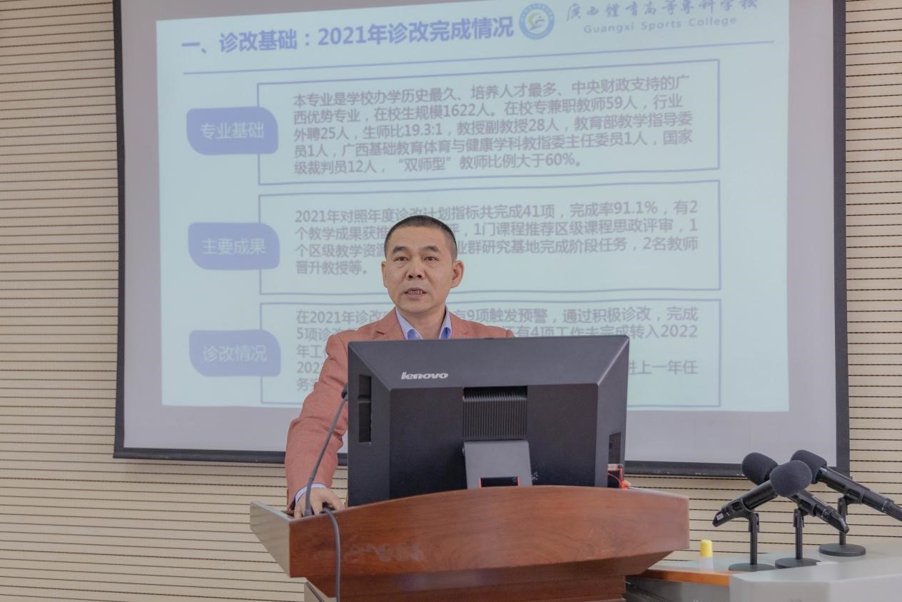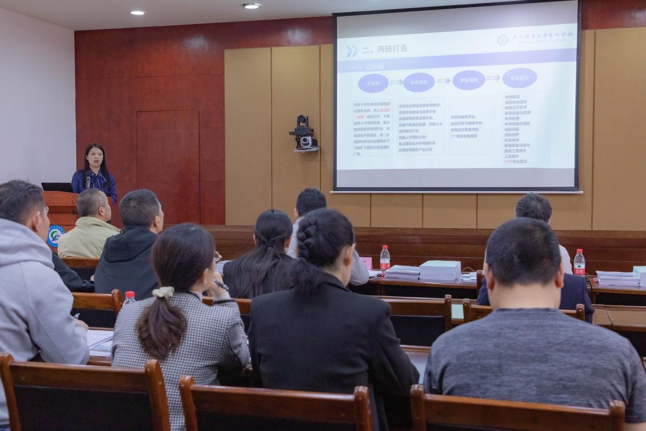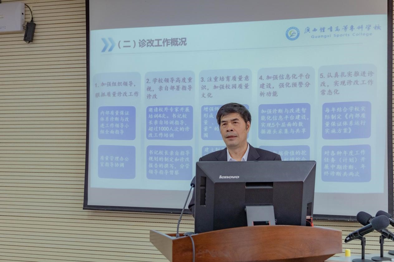 随后,胡英清校长围绕爱体育(中国)诊改工作基础、两链打造、诊改实施、诊改工作成效、不足与改进五个方面,就爱体育(中国)内部质量保证体系诊断与改进工作情况进行汇报。苏祝捷教授对体育教育专业作了诊改汇报,宁陶副教授作了教师个人诊改工作汇报。