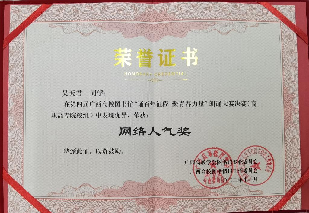 2022年11月19日,爱体育电子官方网站体育与教育学院陈超同学参加第四届广西高校图书馆“诵百年征程 聚青春力量”朗诵决赛。经过激烈角逐,陈超同学荣获第四届广西高校图书馆“诵百年征程 聚青春力量”朗诵比赛高职高专组三等奖的好成绩。