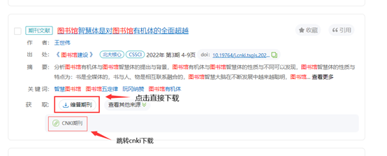 检索名称后进入检索结果页面,在文章下方会有文献传递以及文章收录数据库标识,拥有维普期刊标识的可以直接点击下载,点击其他数据库标识的可以跳转到该数据库下载。如果仅有文献传递标识的可使用文献传递功能获取。
