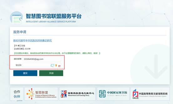 点击文献传递后进入传递界面,只需在申请接面输入邮箱以及验证码,稍后等待几分钟即可收到所需文献,可以进入邮箱下载,也可进入右上方我的文献申请里查看。