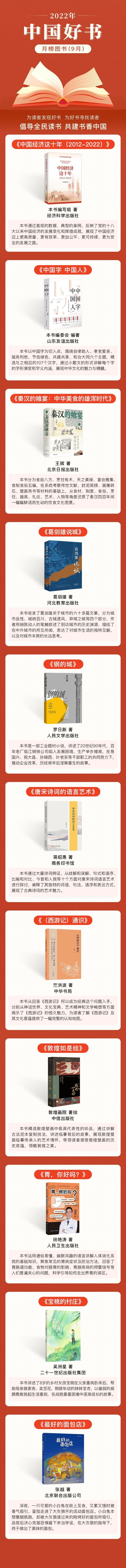 在中宣部出版局指导下,经中国图书评论学会组织评选,2022年9月“中国好书”榜单发布:《中国经济这十年(2012—2022)》《中国字 中国人》《秦汉的飨宴:中华美食的雄浑时代》《葛剑雄说城》《钢的城》《唐宋诗词的语言艺术》《〈西游记〉通识》《敦煌如是绘》《胃,你好吗?》《宝桃的村庄》《最好的面包店》入选。