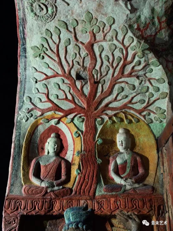 与云冈大量出现的,根据《妙法莲花经·见宝塔品》塑造的多宝、释迦二佛并坐形象不同,窟门内壁最上层塑造了一对依《涅槃经·圣行品》之记载,在树下坐禅修行的佛像。身着袒右肩式袈裟、结禅定手印的二佛陀,相向端坐于枝叶茂盛、树冠巨大的无忧树下。工匠在这里用心刻画了一处静修禅法的境界,以大树寓之:树干的沧桑,树枝的繁茂,树叶的朝气,树冠的优美。佛教的圣树来源于自然而不同于自然,它象征着安稳和坚忍。天空上舞动身姿的紧那罗,已然与飘飞的莲花化生者一起,迎候着芸芸众生的光顾。修禅者顶上的肉髻和背后光芒表明,佛陀住于无上三昧之中。