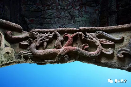 窟门上方长约3.2米,宽约0.8米的顶部区域雕刻龙形,由于南侧风化坍塌,使雕刻于顶部的二龙身部分缺失。现存两首相对、身躯相交的二龙,龙首朝向洞窟内。二龙形象鳞纹清晰、长角尖耳、厚眉短鼻、鳄吻獠牙、屈颈昂头、兽爪虎尾。龙爪三趾,一爪上举、一爪后蹬,躯体向两侧伸开,间或缀以叶状云气纹。东侧的龙形下颚有山羊须,颈有菱形纹,形体略大于西边的龙形。东侧龙形耳、角位置和西侧龙形前爪、身躯位置分别有明显裂隙。