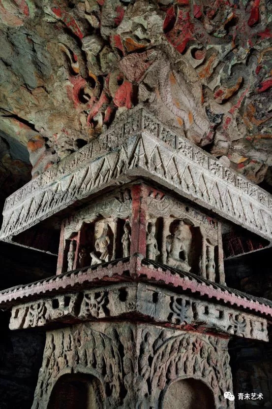 塔柱上下层均有出檐。下檐为仿一斗三升人字拱(雕刻为兽形和天人形)支撑的瓦垄屋顶,瓦垄下檐为半圆形檐椽。上檐为方形宝盖,宝盖内顶部雕刻宝装莲瓣图案,靠塔身内侧为原雕,外侧为修补后的仿品。塔角上方窟顶出现鱼头裂齿补石,系20世纪70年代石工补刻。