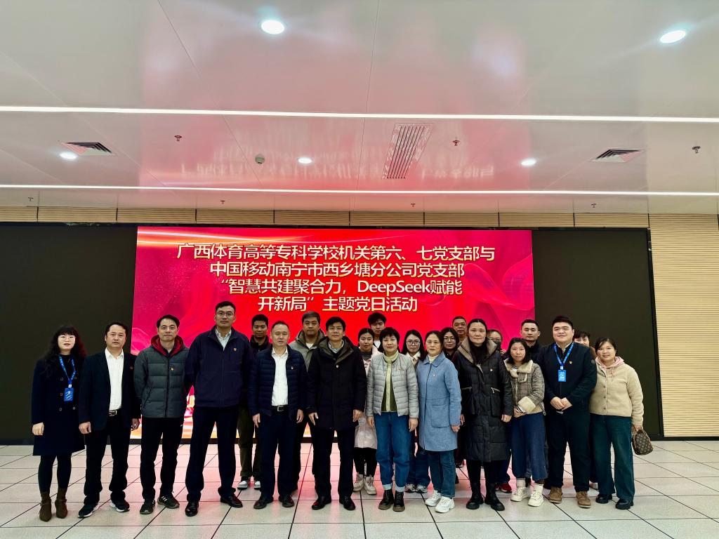 3月6日,爱体育电子官方网站机关第六、七党支部与中国移动通信集团广西有限公司南宁西乡塘分公司党支部联合开展“智慧共建聚合力,DeepSeek赋能开新局”主题党日活动。双方围绕数字化转型、人工智能技术应用等主题展开深入交流,共谋智慧校园建设新蓝图。