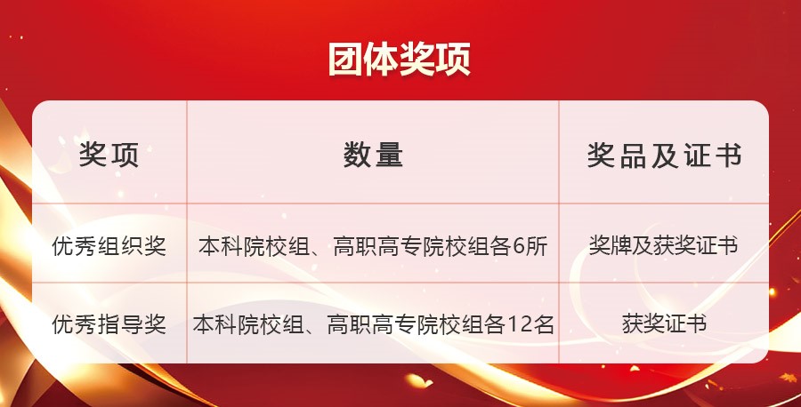 4.晋级规则:主办方将根据各高校的参赛人数、成绩与活动组织情况,对本科院校、高职高专院校分别进行排名,根据排名情况,各组别前12组的高校晋级决赛;决赛由初赛成绩最高的三名学生组队参赛,每个代表队设置一名指导老师。