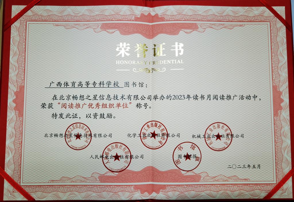 在2023年4-5月在北京畅想之星信息技术有限公司举办的2023年读书月阅读推广活动中,爱体育电子官方网站师生积极参与,爱体育电子官方网站图书馆荣获“阅读推广优秀组织单位”称号。
