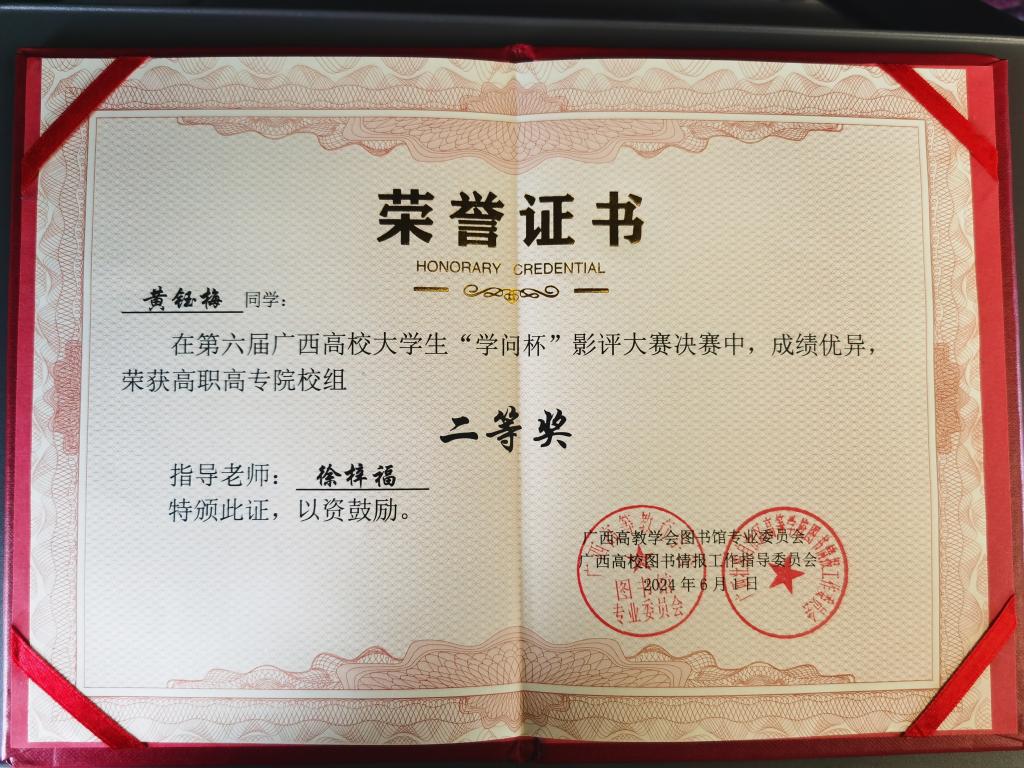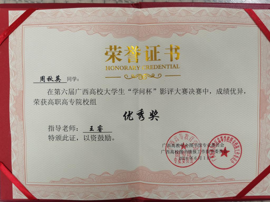 喜讯!爱体育电子官方网站2名学生在2024年第六届广西高校大学生“学问杯”影评大赛决赛中荣获佳绩