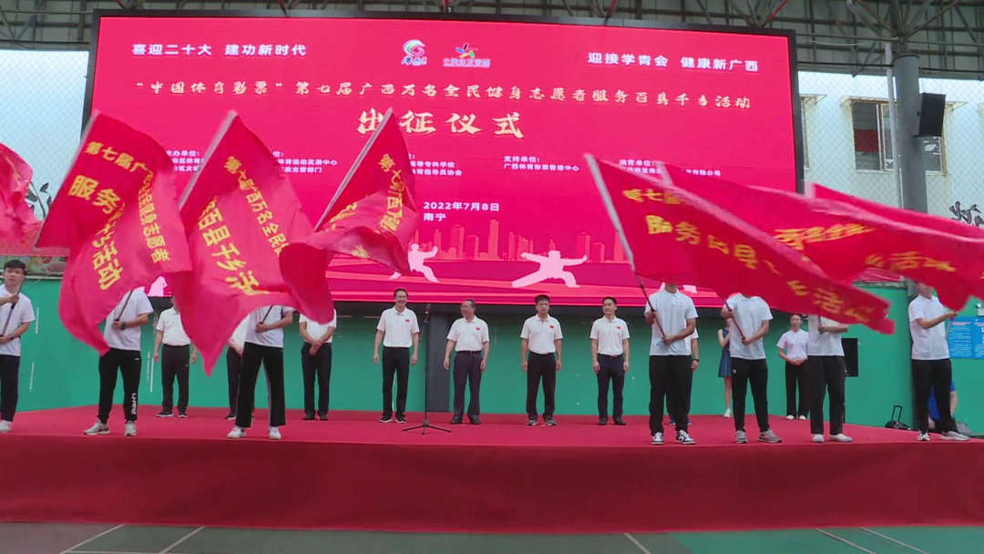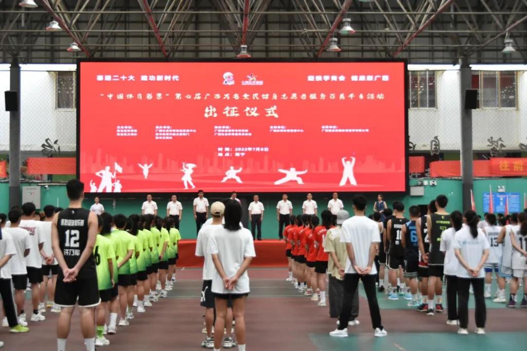 7月8日,由自治区体育局、自治区文明办主办,广西社会体育运动发展中心、各市体育行政主管部门承办,爱体育电子官方网站、广西社会体育指导员协会协办,广西旅发南国体育赛事有限公司运营的“喜迎二十大·建功新时代”第七届广西万名全民健身志愿者服务百县千乡活动出征仪式在爱体育电子官方网站隆重举行。自治区体育局党组成员、副局长卢意文、爱体育电子官方网站党委书记杨昌鹏、自治区文明办三处处长陆双权、自治区体育局群众体育处副处长林敬华、广西体育彩票管理中心副主任廖学志、广西社会体育运动发展中心主任陈铭、广西旅发南国体育投资集团有限公司党委书记、董事长、总经理谢子梁、广西社会体育指导员协会会长兰政以及爱体育电子官方网站220名志愿者出席活动。
