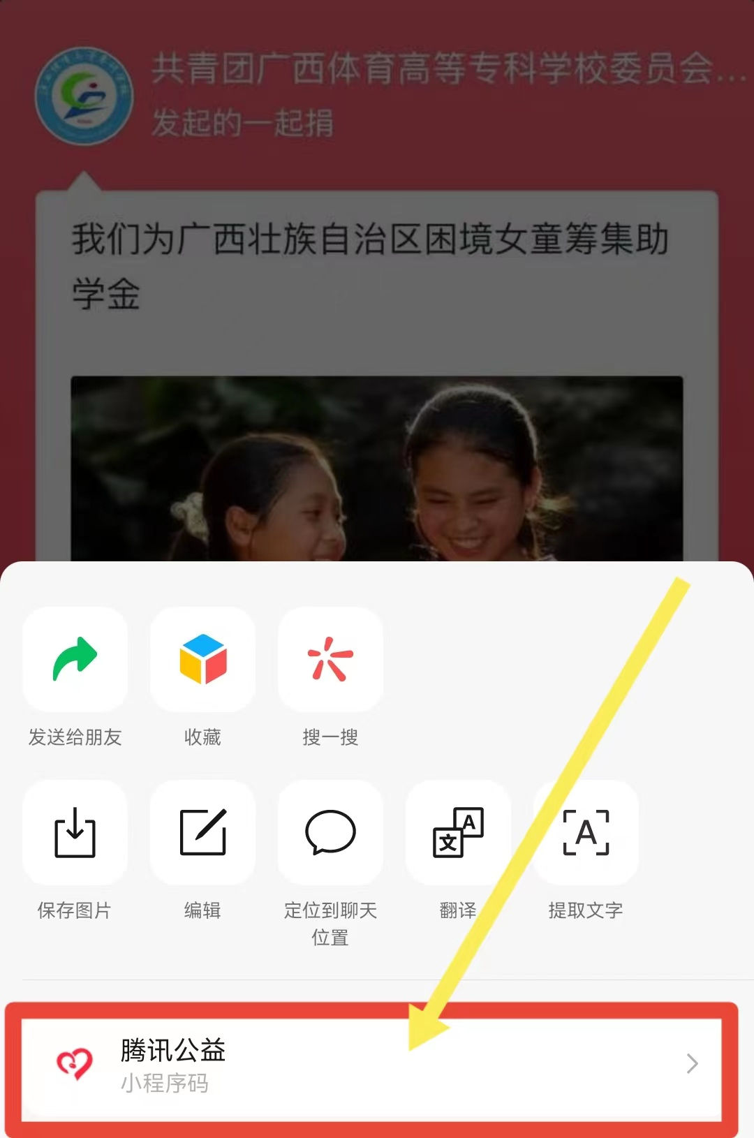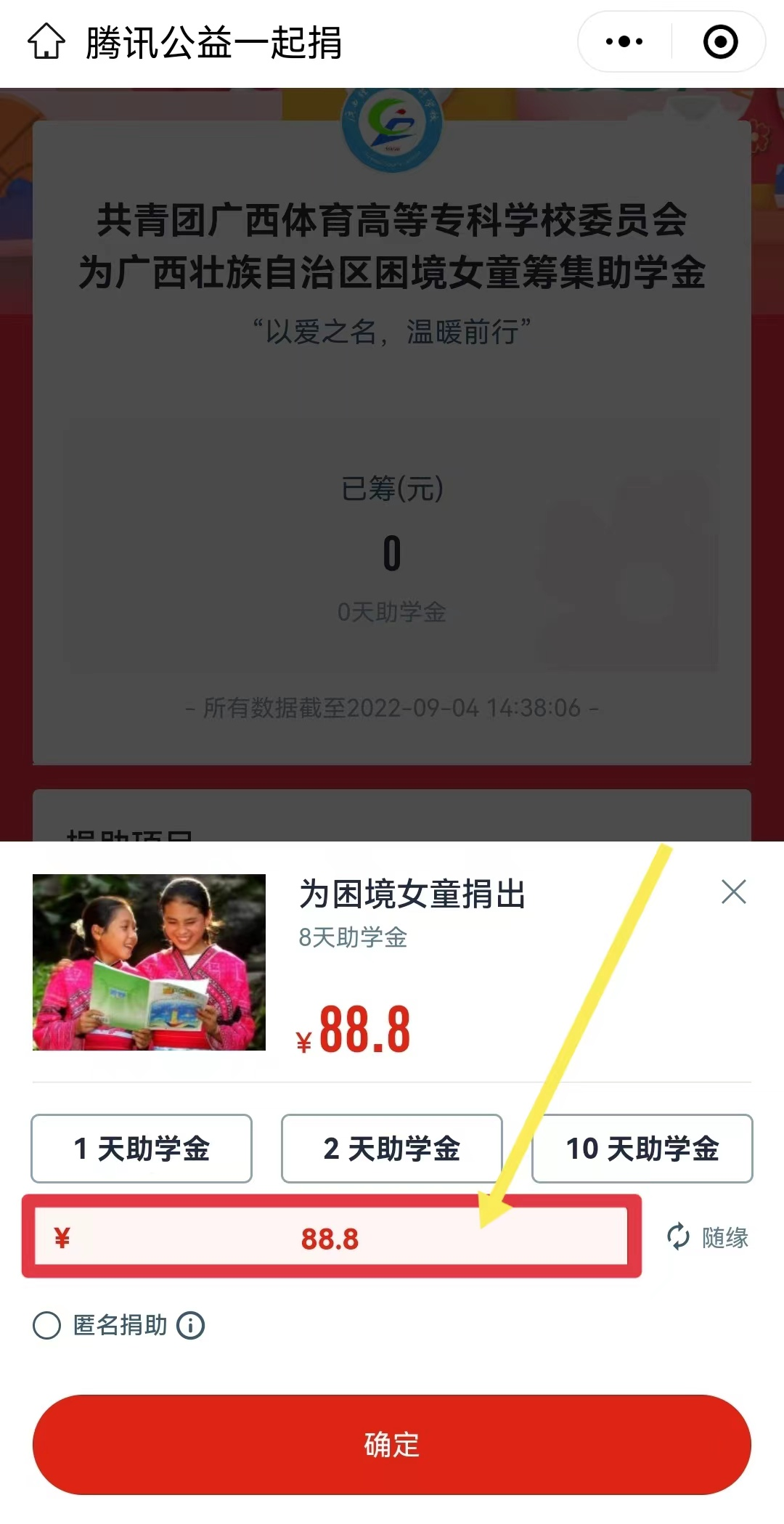 微信扫描共青团爱体育电子官方网站委员会“春蕾计划捐款”项目二维码→点击进入腾讯公益进入小程序→点击下方“捐出第一笔”→选择捐赠金额或自定义金额→点击确定→输入支付密码,即可完成捐赠。