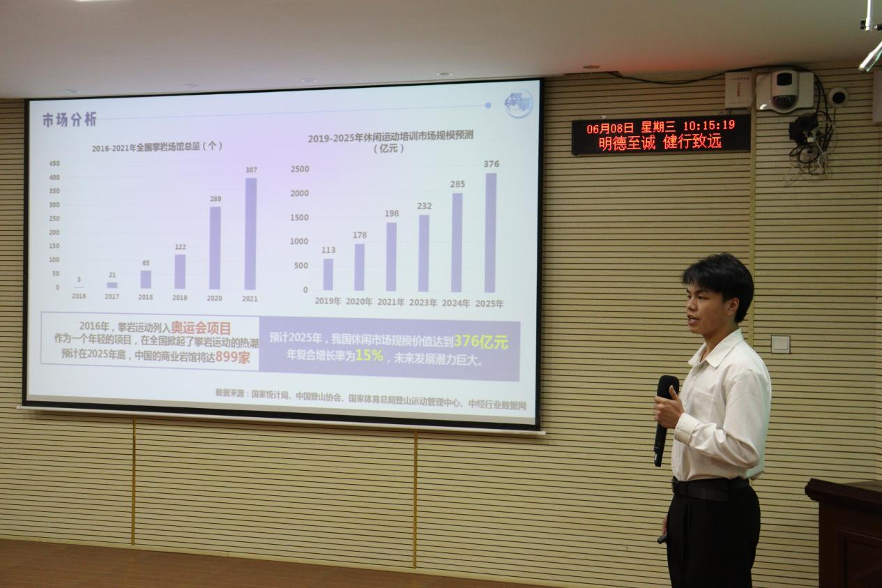 为积极营造“互联网+”创新创业竞赛的氛围,切实提高爱体育电子官方网站学生创新创业的意识和能力,校团委于6月8日在综合楼402报告厅举办第八届中国国际“互联网+”大学生创新创业大赛校内选拔赛决赛。党委副书记李爱民,学生工作处处长韦伦国,学生工作处副处长、团委书记黎智达,校团委副书记韦宛辰,运动科学与健康学院党总支副书记胡天晓,体育经济管理学院党总支副书记祁丽及各学院团委书记出席本次比赛。