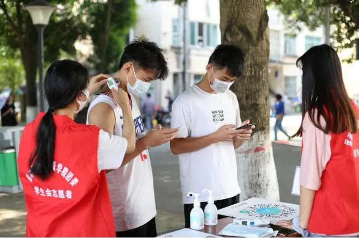 志愿者对参加献血同学进行“三码联查”和体温检测